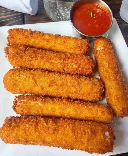 Dedos de queso mozzarella deliciosos acompañados con aderezos ranch, cátchup y papas fritas.