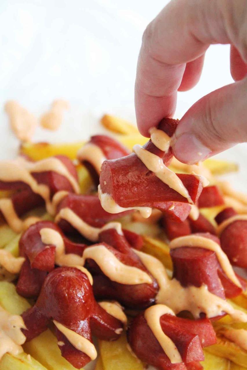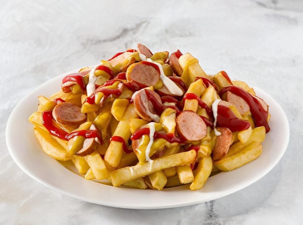 Papas fritas acompañadas de salchichas, con queso de nacho, mayonesa, cátchup.