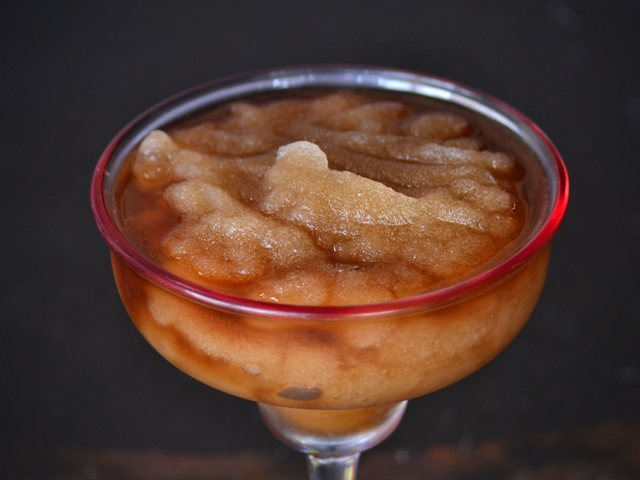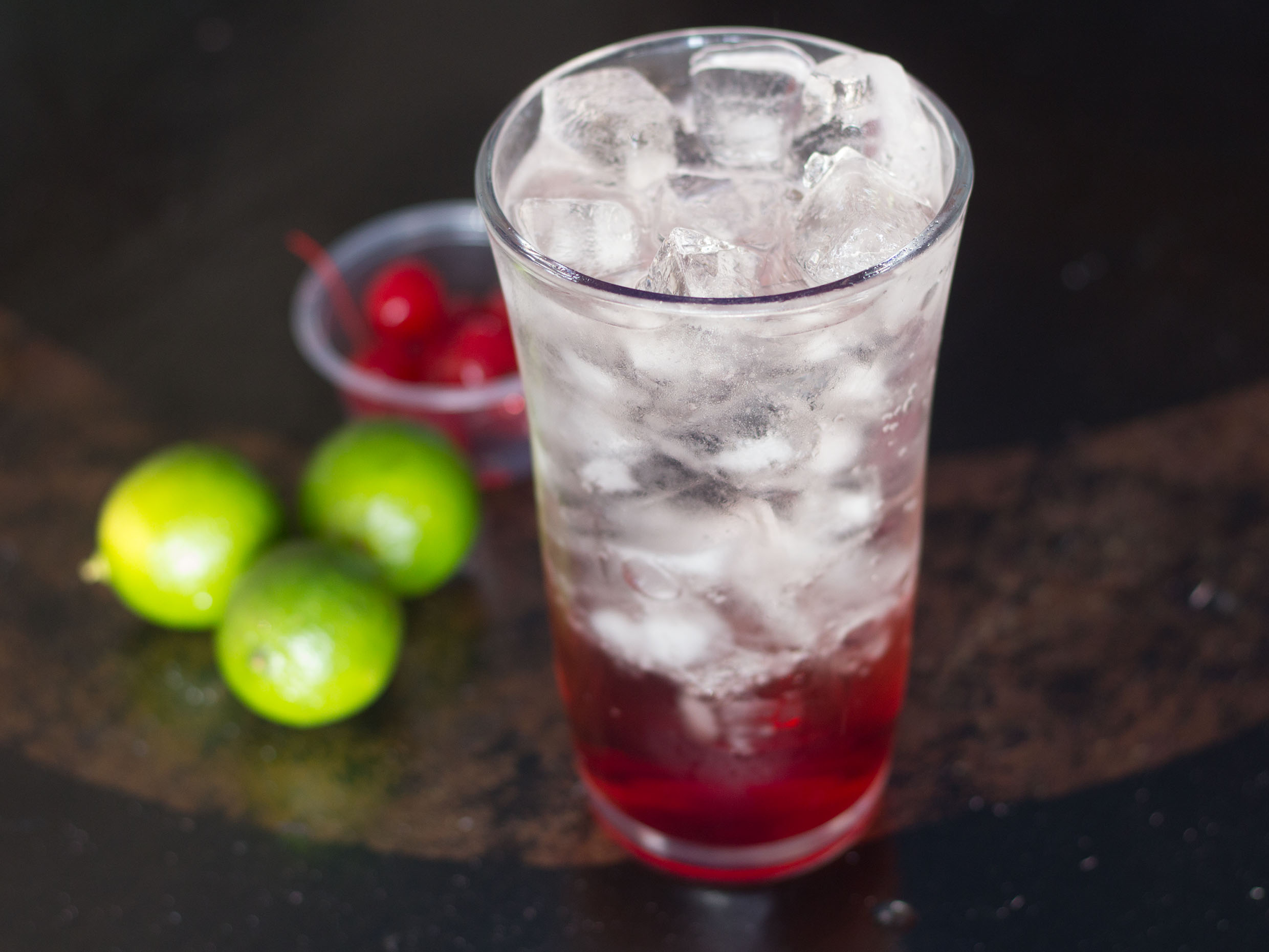 una cama de cerezas con soda de limon y esencia de cereza.