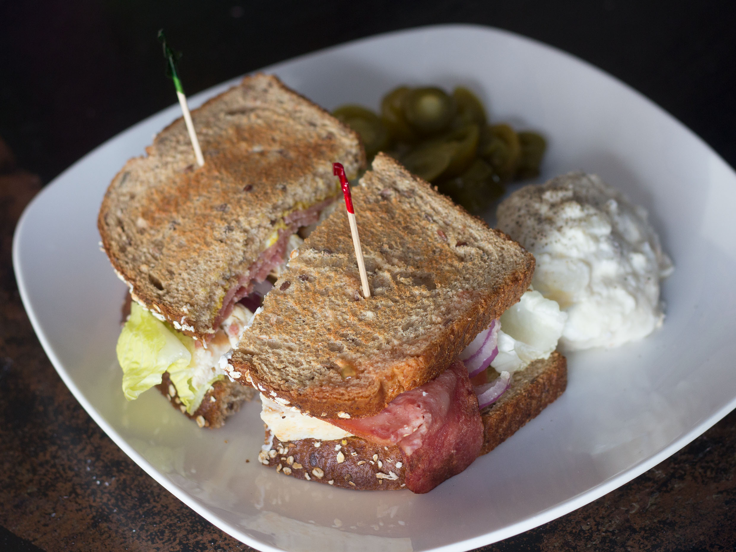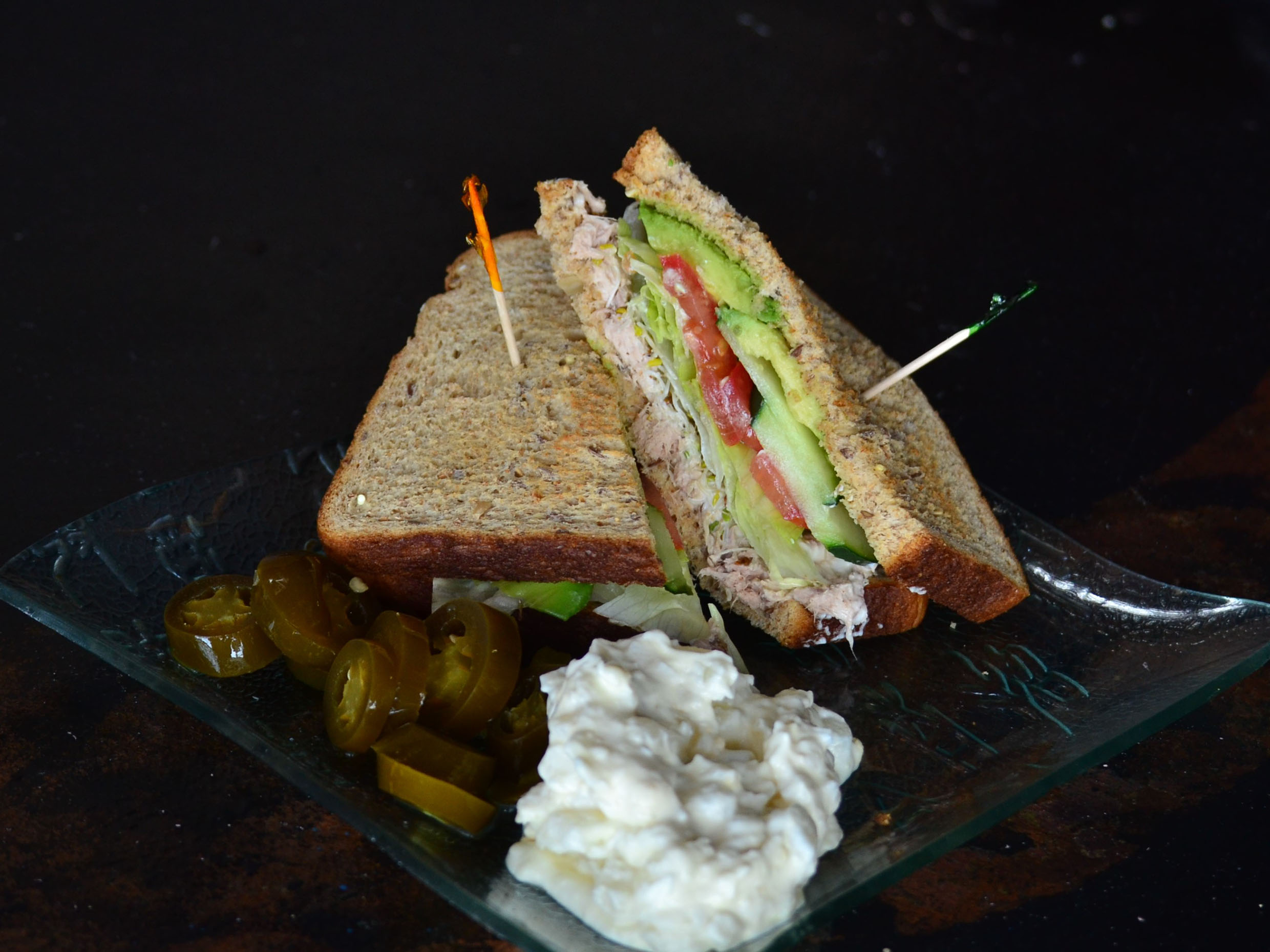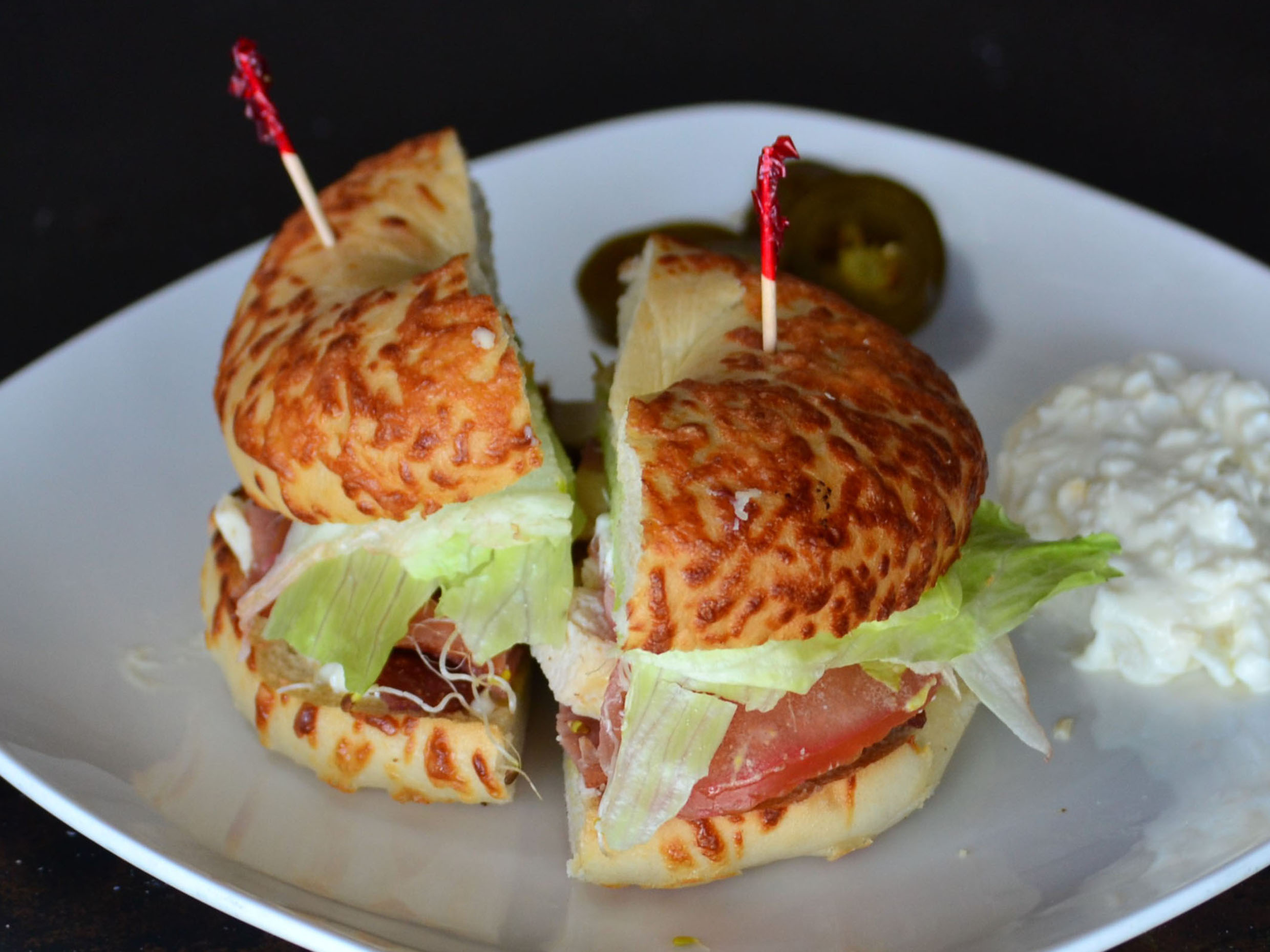 Bagel pollo y tocino con lechuga romana, tomate, cebolls morada y alfalfa acompañado de chiles jalapeños y ensalada de papa.