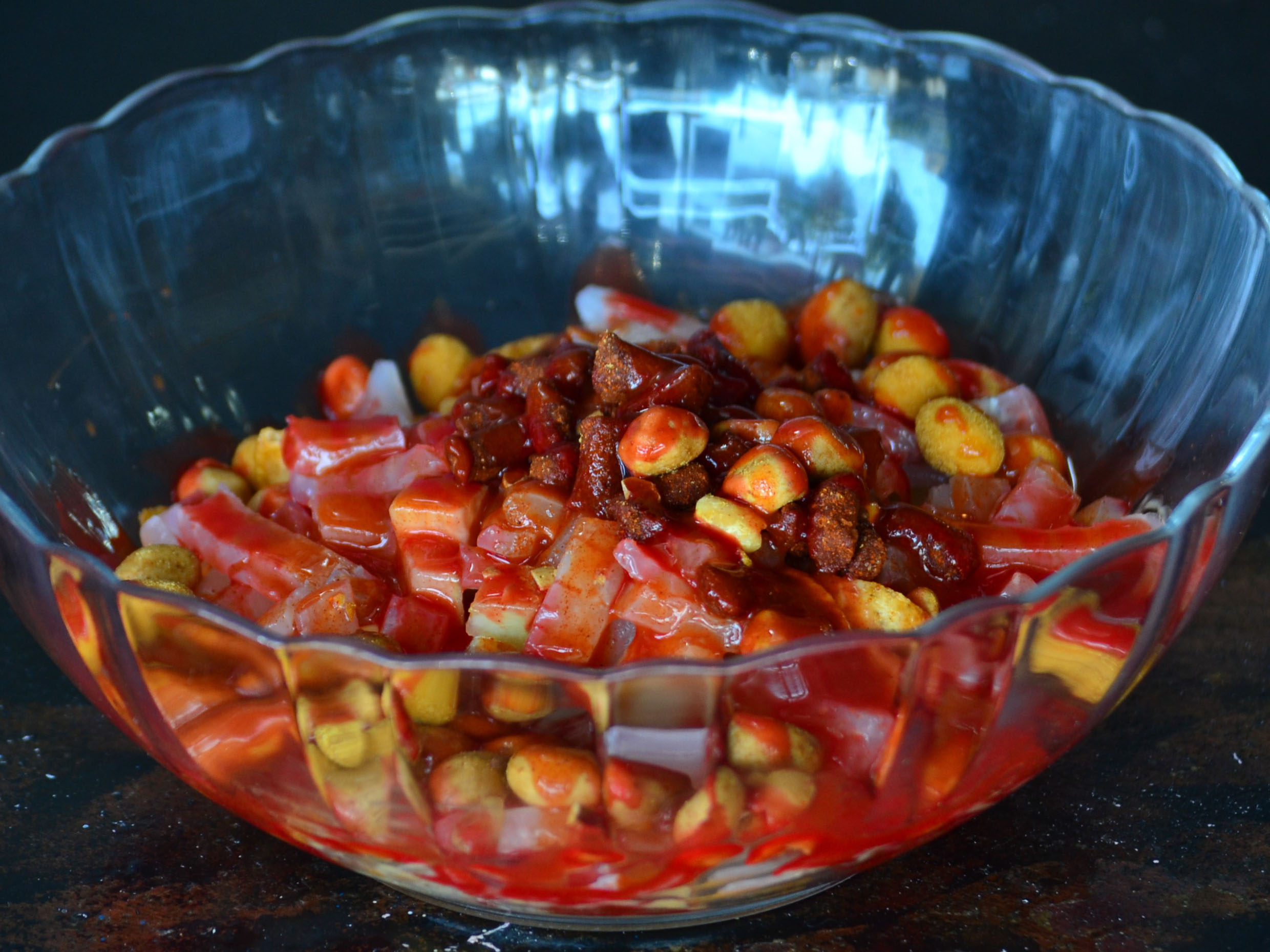 Tostitos con cacahuates, chaka chaka, cueritos, pepino, salsa, chamoy, limón y Clamato.