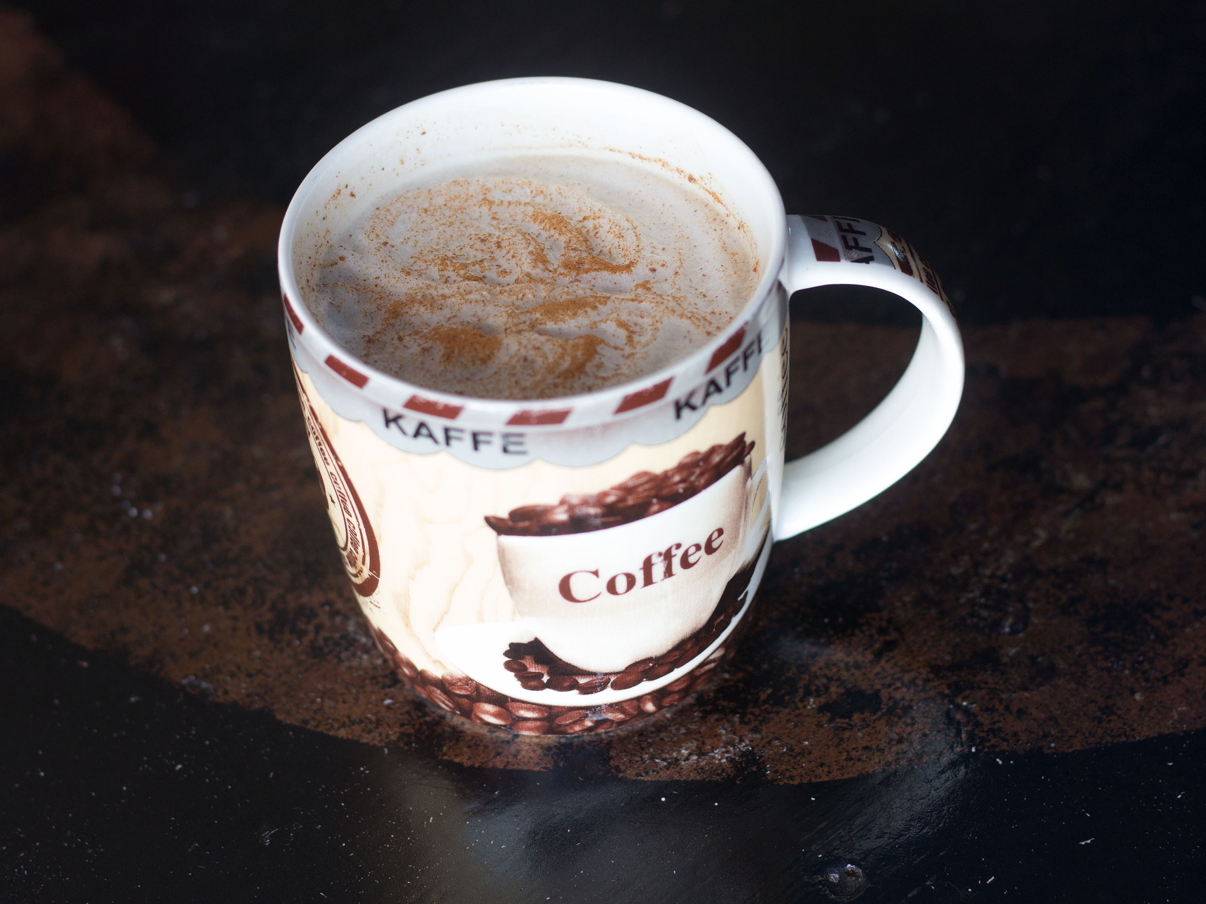 Té chai especies, leche y salsa de chocolate obscuro.