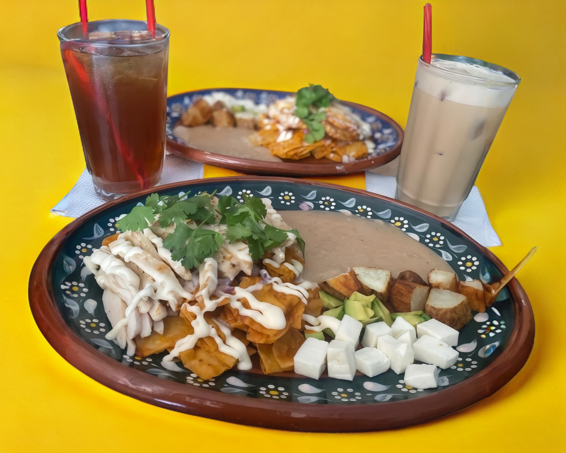Ricos chilaquiles en salsa roja o verde, incluye papitas, frijoles, queso fresco, aguacate y a elegir pollo o huevo