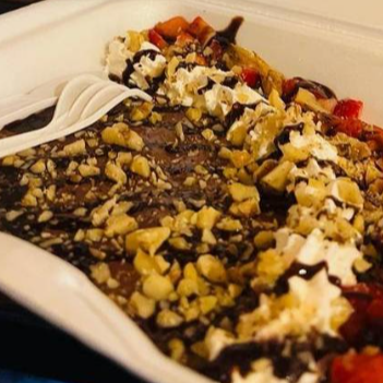Nutella, fresa, chispas, nuez, crema batida y nieve.