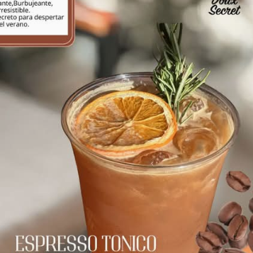 Bebida refrescante, contiene espresso, limón, endulzado con jarabe natural y agua tónica.