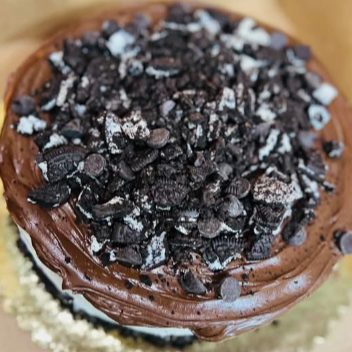Pastel de crepas relleno de queso, cubierto de Nutella y Oreo.