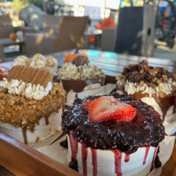 Relleno de queso Philadelphia, mermelada, manzana con canela, nuez o almendras, crema batida y nieve.