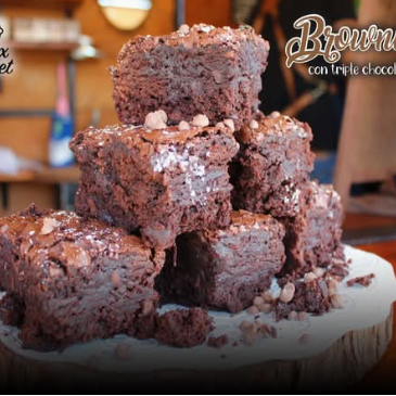 Pastel de crepas relleno de queso, cubierto de Nutella con trocitos de brownie.