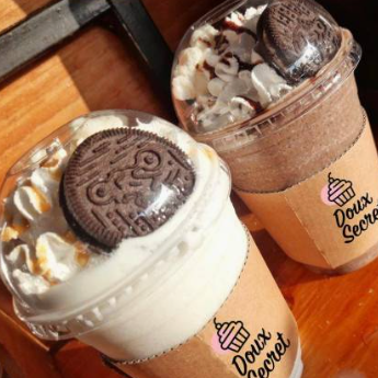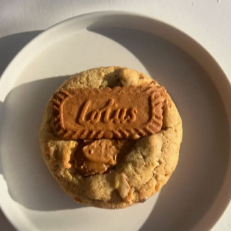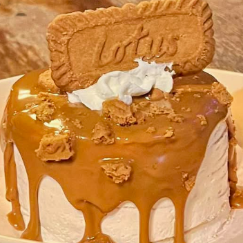 Contiene trocitos de galleta Lotus y nuez en la mezcla, con relleno de crema de Lotus y coronado con una galleta Lotus.