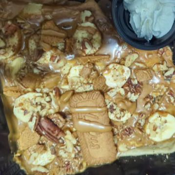 Crema y galleta Biscoff, nuez, plátano, crema batida y nieve.