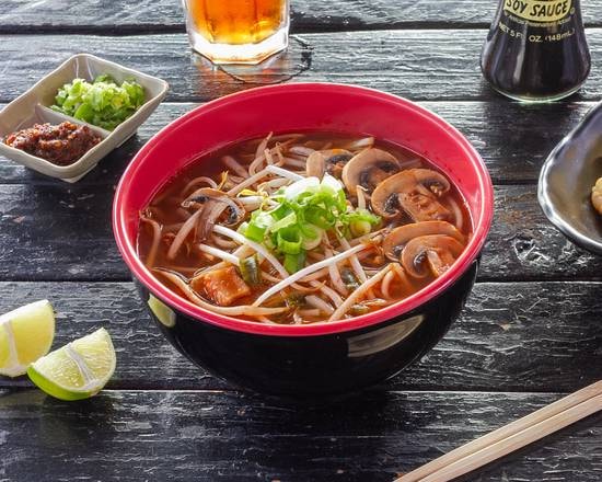 Caldo de mariscos rojo, fideo, chapsui, champiñones, cebollita, camarón y mejillón