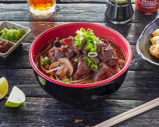 Caldo de res, fideo, chapsui, champiñón, cebollita y carne de res bulgogui