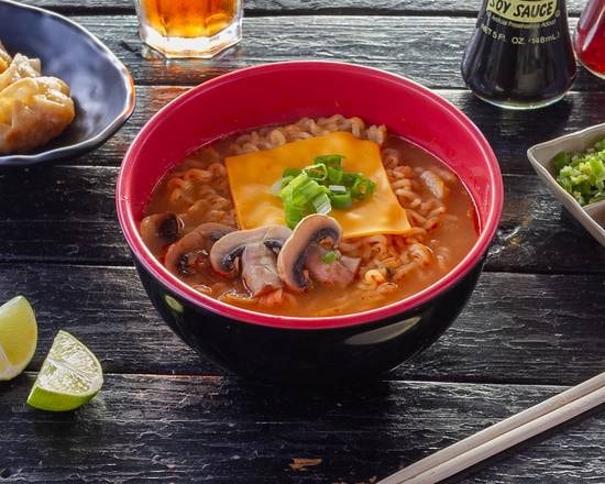 Ramen con caldo de kimchi, fideo, championes, cebolita y kimchi