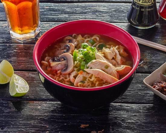 Caldo de pollo levemente picoso, fideo, champiñón, cebollita y pollo