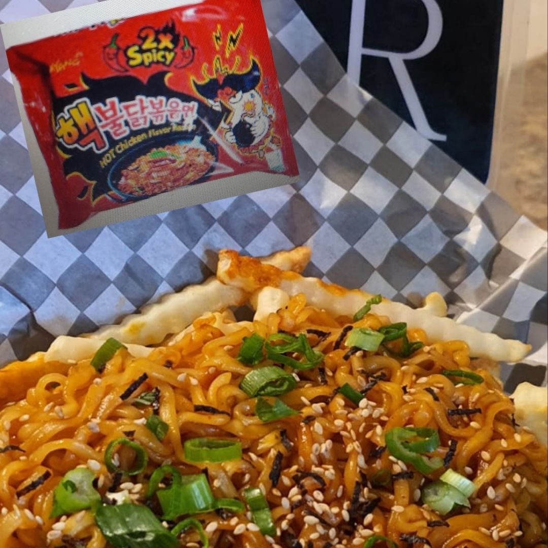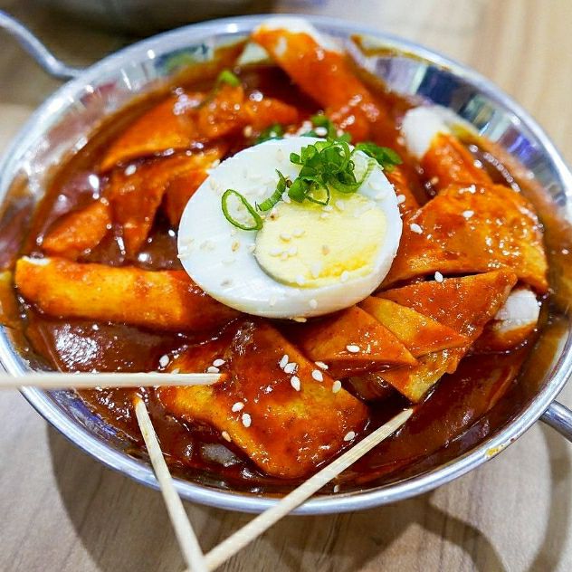 Pastelitos de arroz ,con repollo cebolla y cebolin bañado en una salsa coreana picante agridulce. Acompaña huevo cocido
