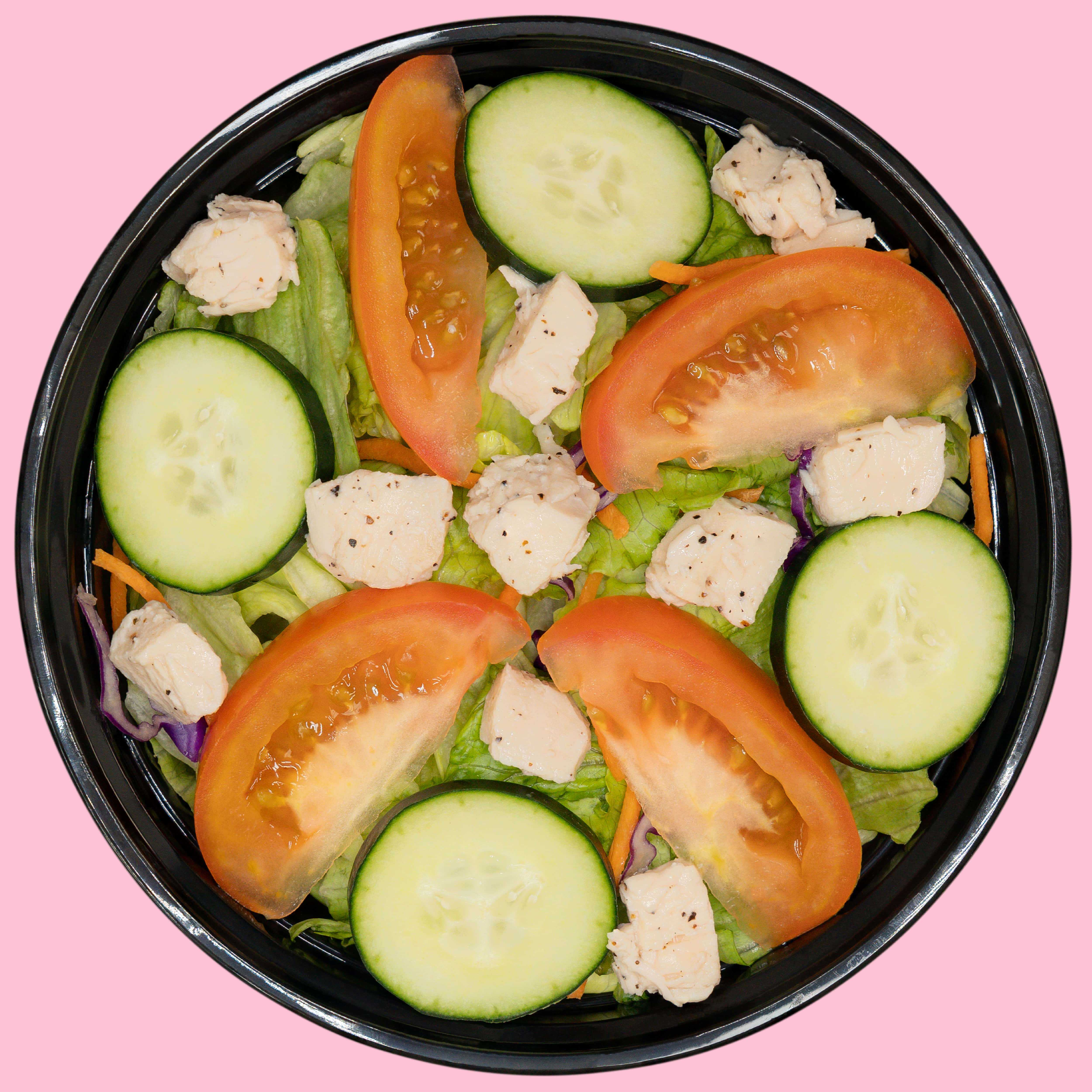 Tomate, pepino, tortilla para pizza, infusión de ajillo, pechuga de pollo y aderezo ranch.