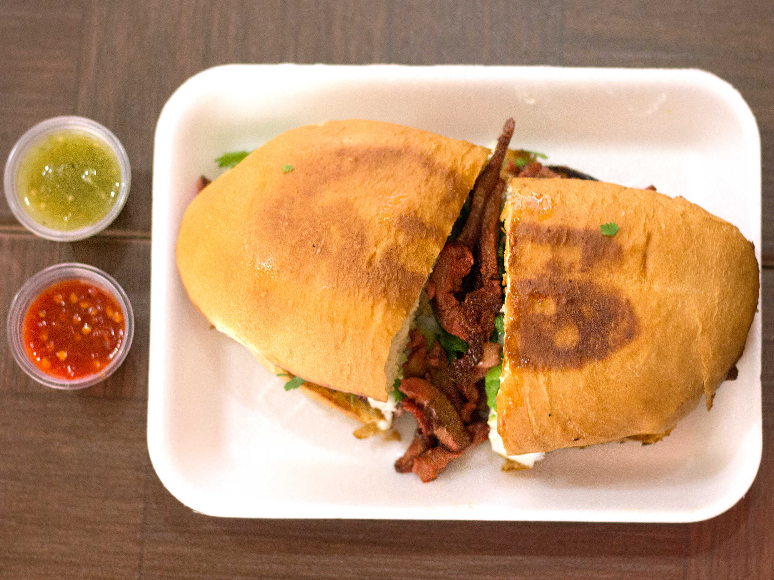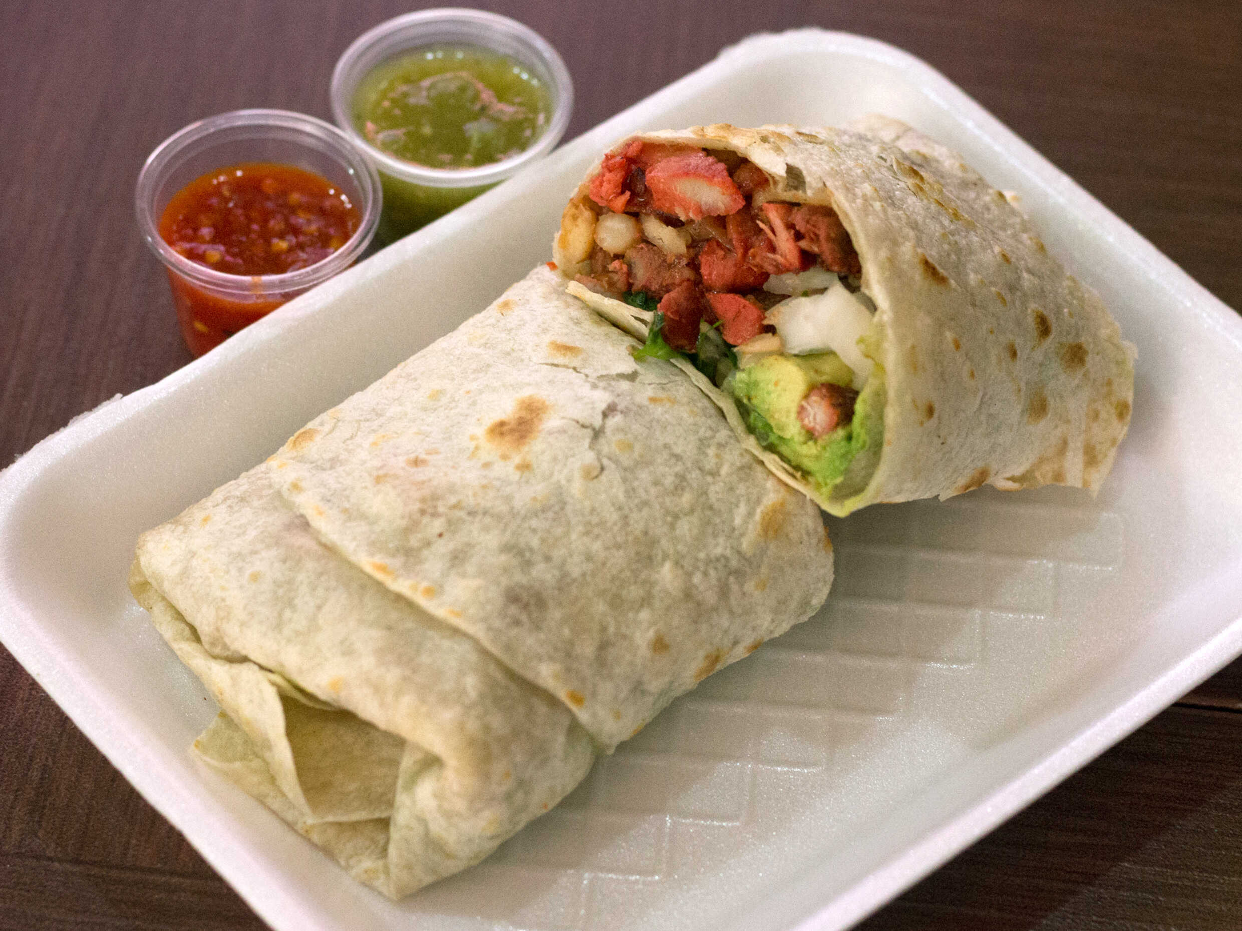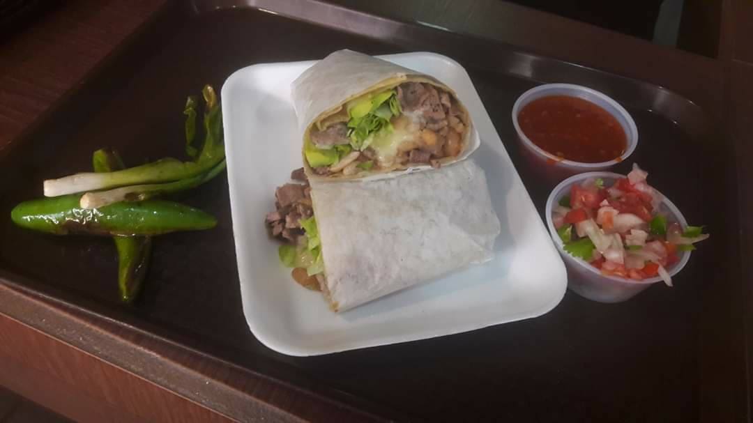 Carne asada, aguacate, lechuga, frijoles, tomate y queso.