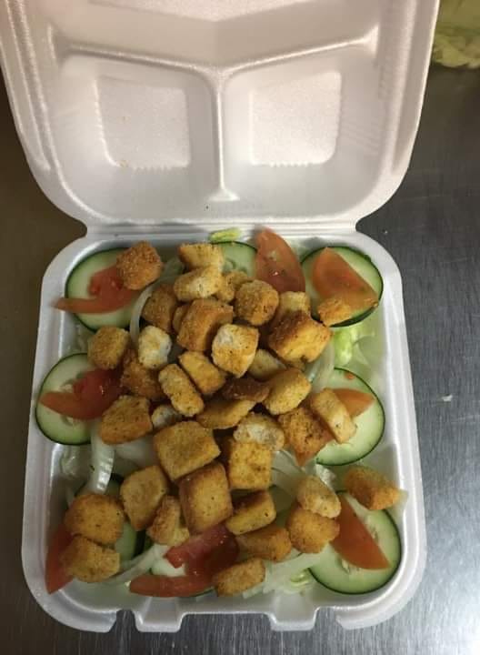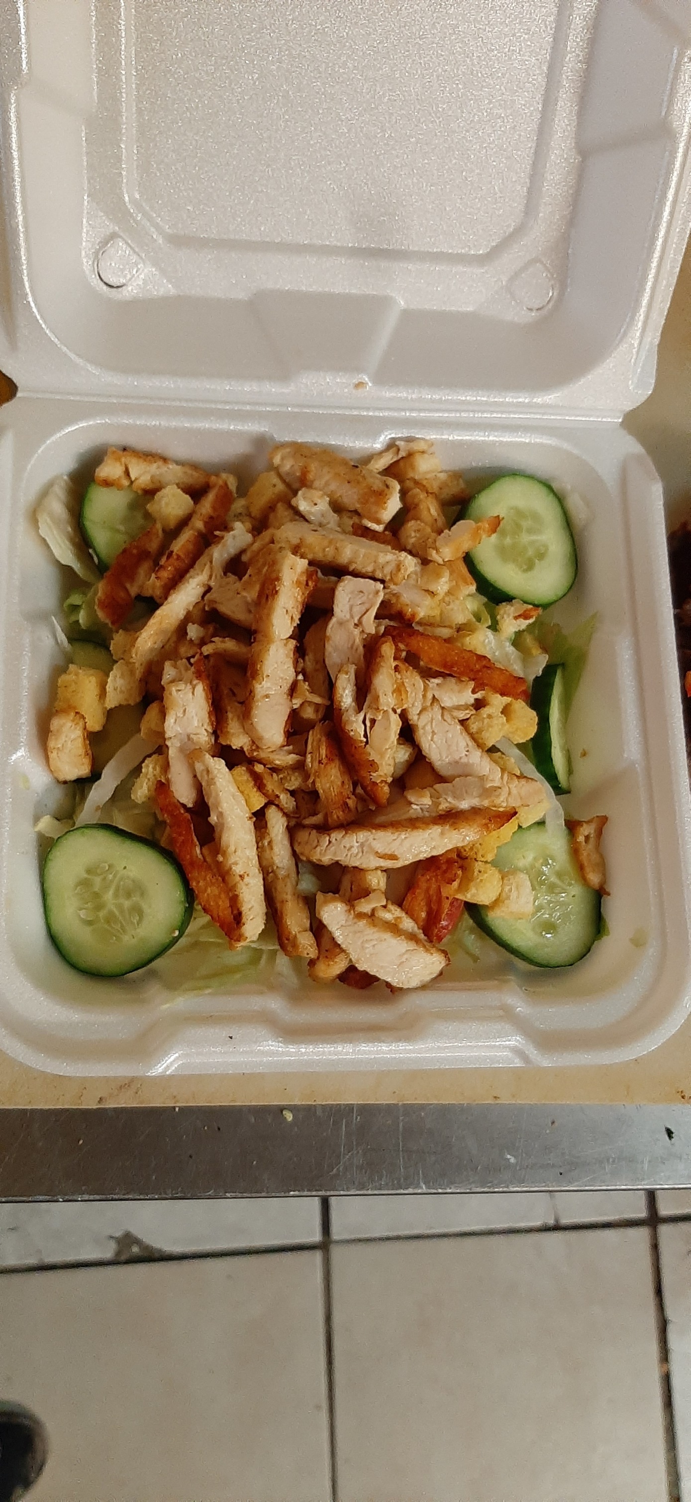 Lechuga, tomate, pepino, gritones y pechuga de pollo.