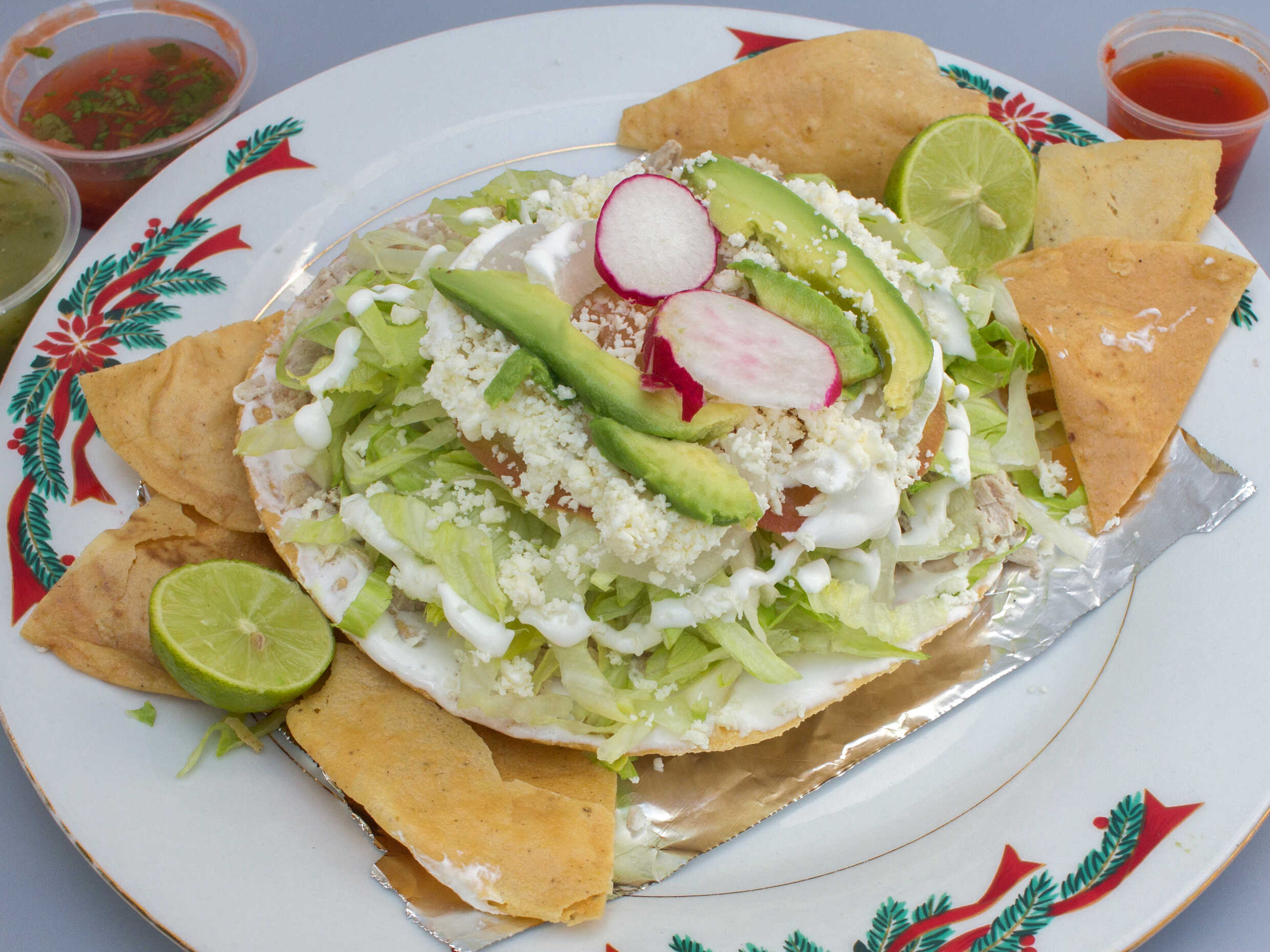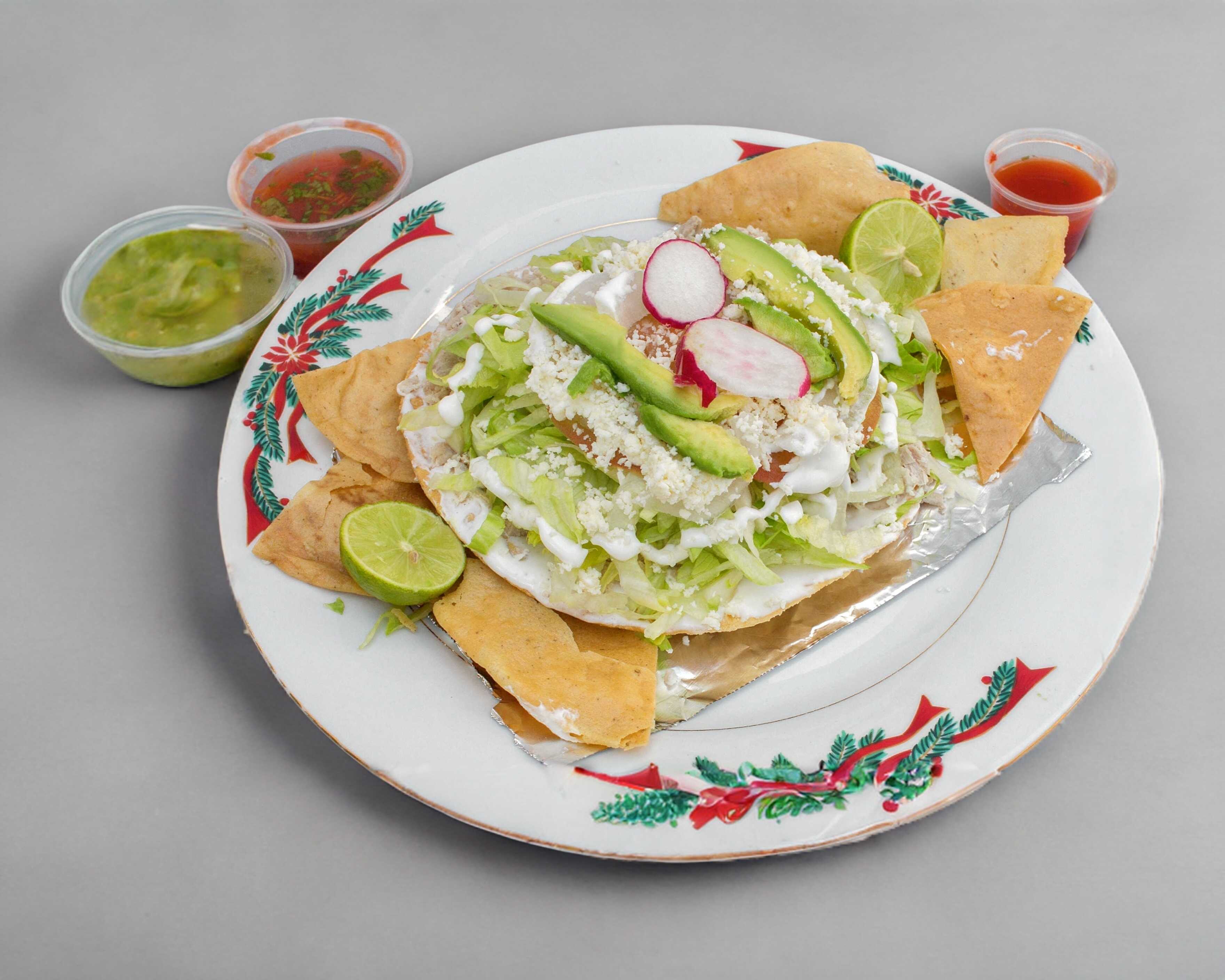 3 piezas, lechuga, queso, crema, rabanos, totopos, salsa roja, verde y picante