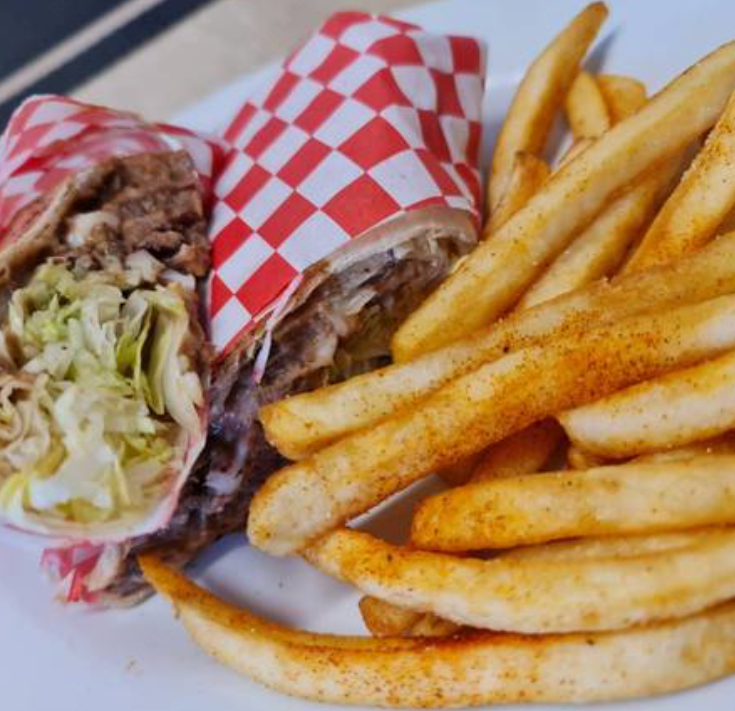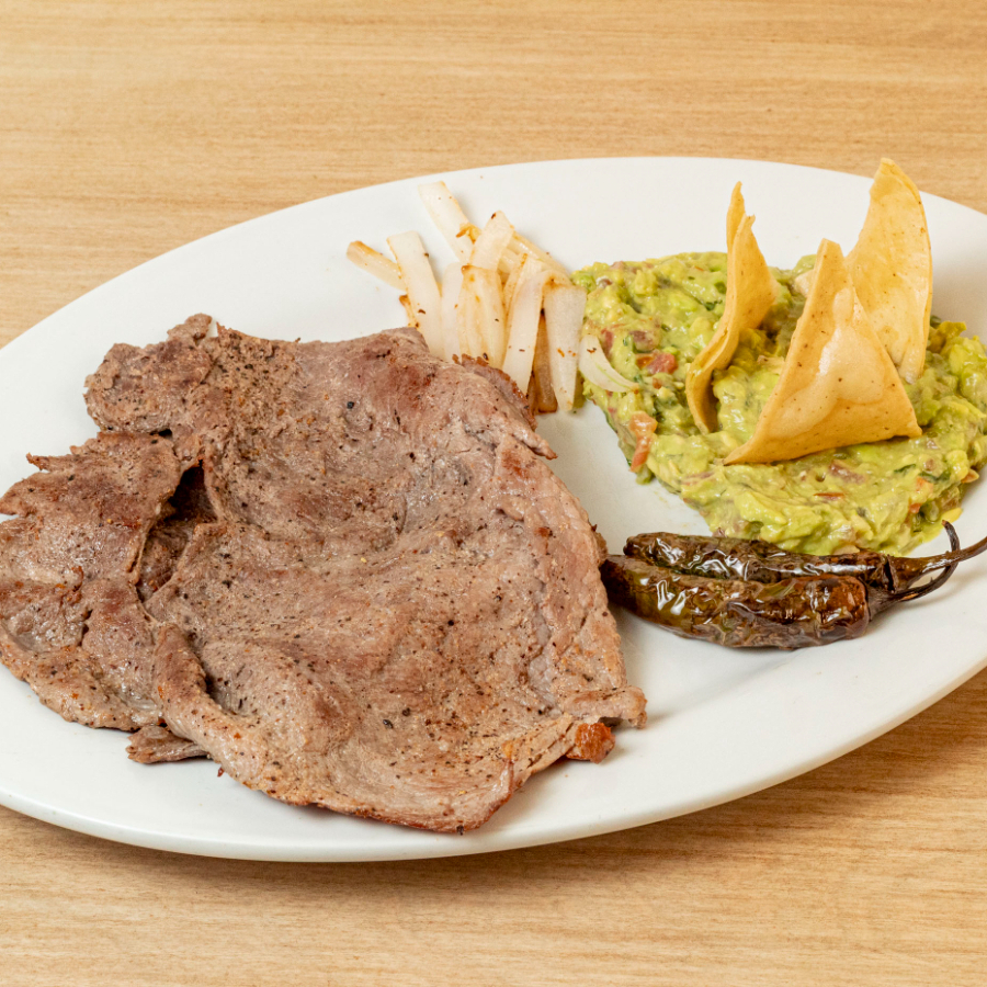Carne asada, aguacate, tomate, cebolla asada y mayonesa, papas fritas.