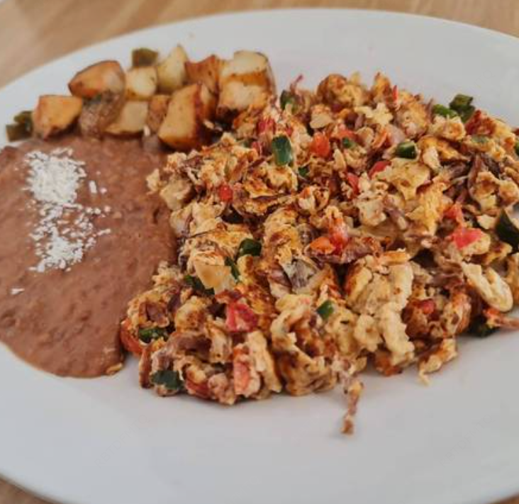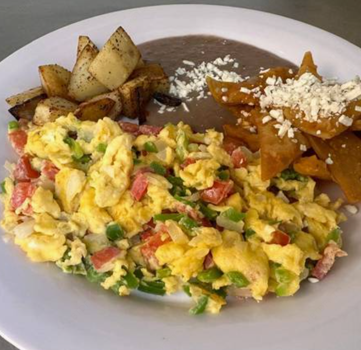 2 pzas Huevo revuelto con verdura acompañado de chilaquiles rojos.