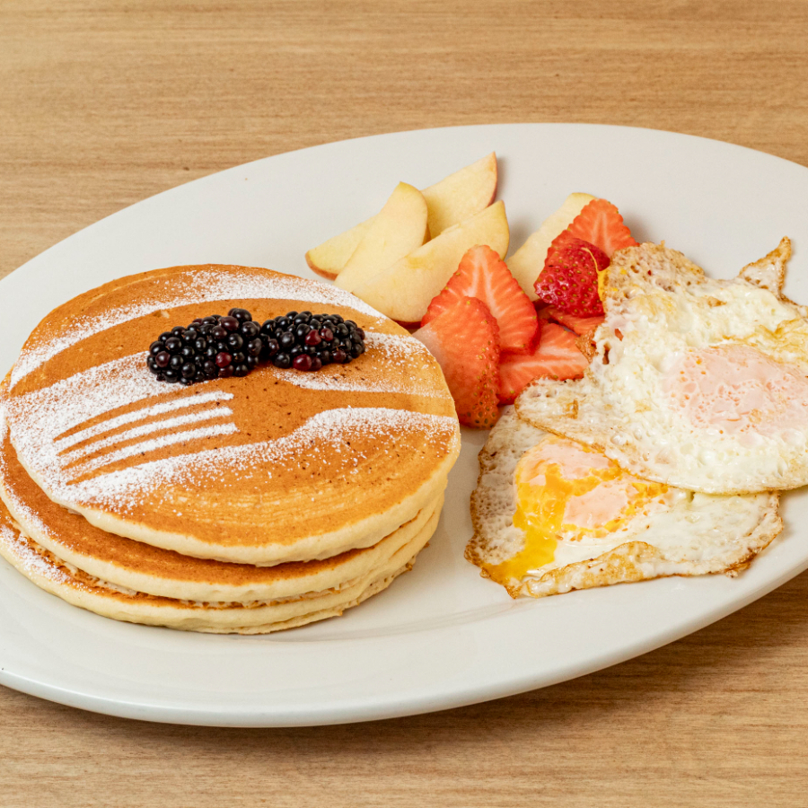 (3) Hot cakes acompañados de fresa y plátano o (2) huevos al gusto.
