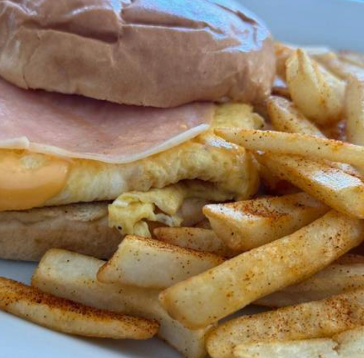 Huevo, jamón y queso acompañado de papas caseras.