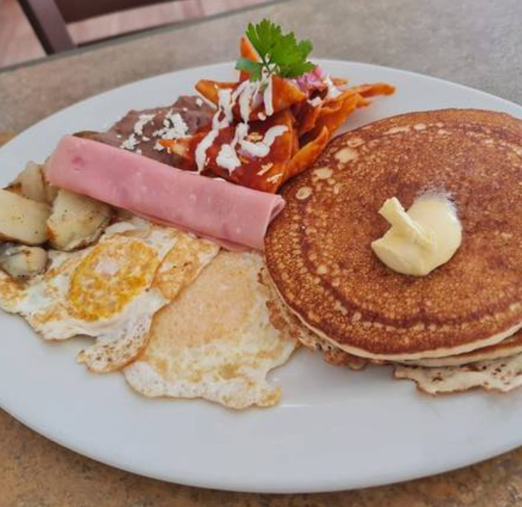 2 Huevos al gusto servidos con (2) hot cakes, chilaquiles, jamón y papas caseras.