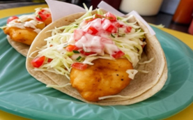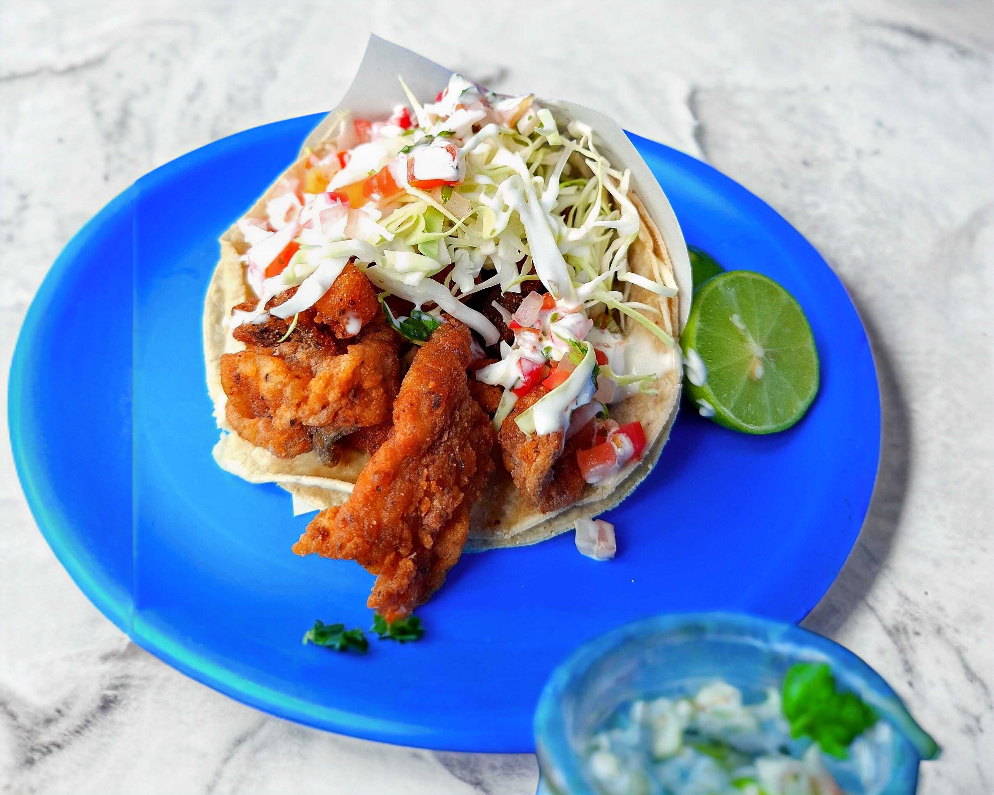 Taco de pescado capeado en tortilla de maíz.