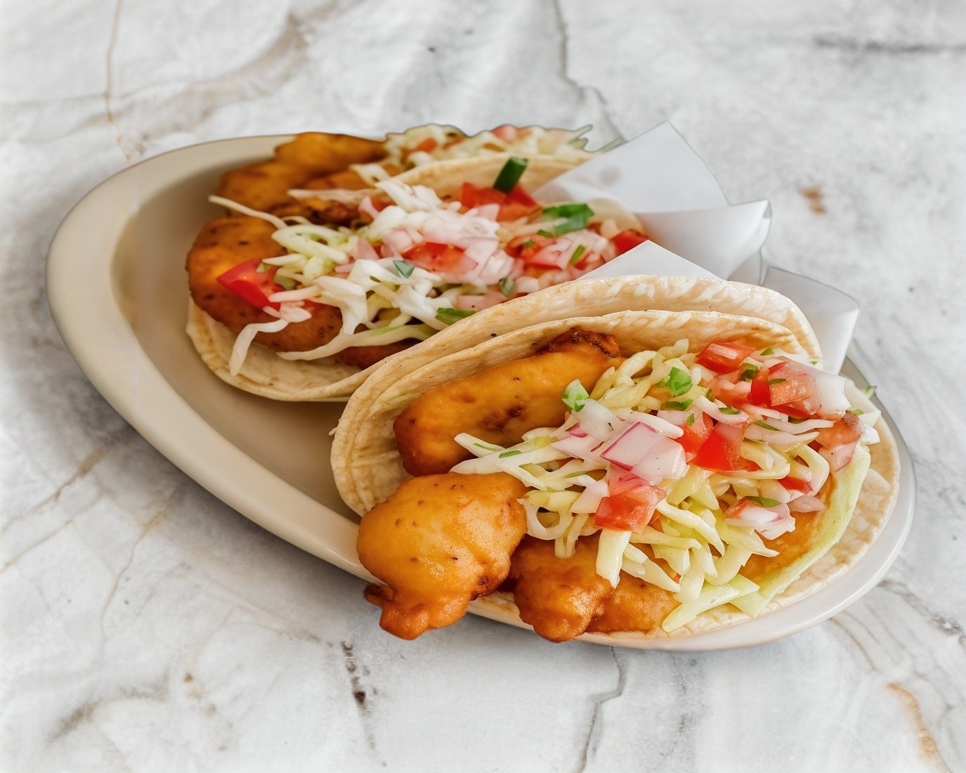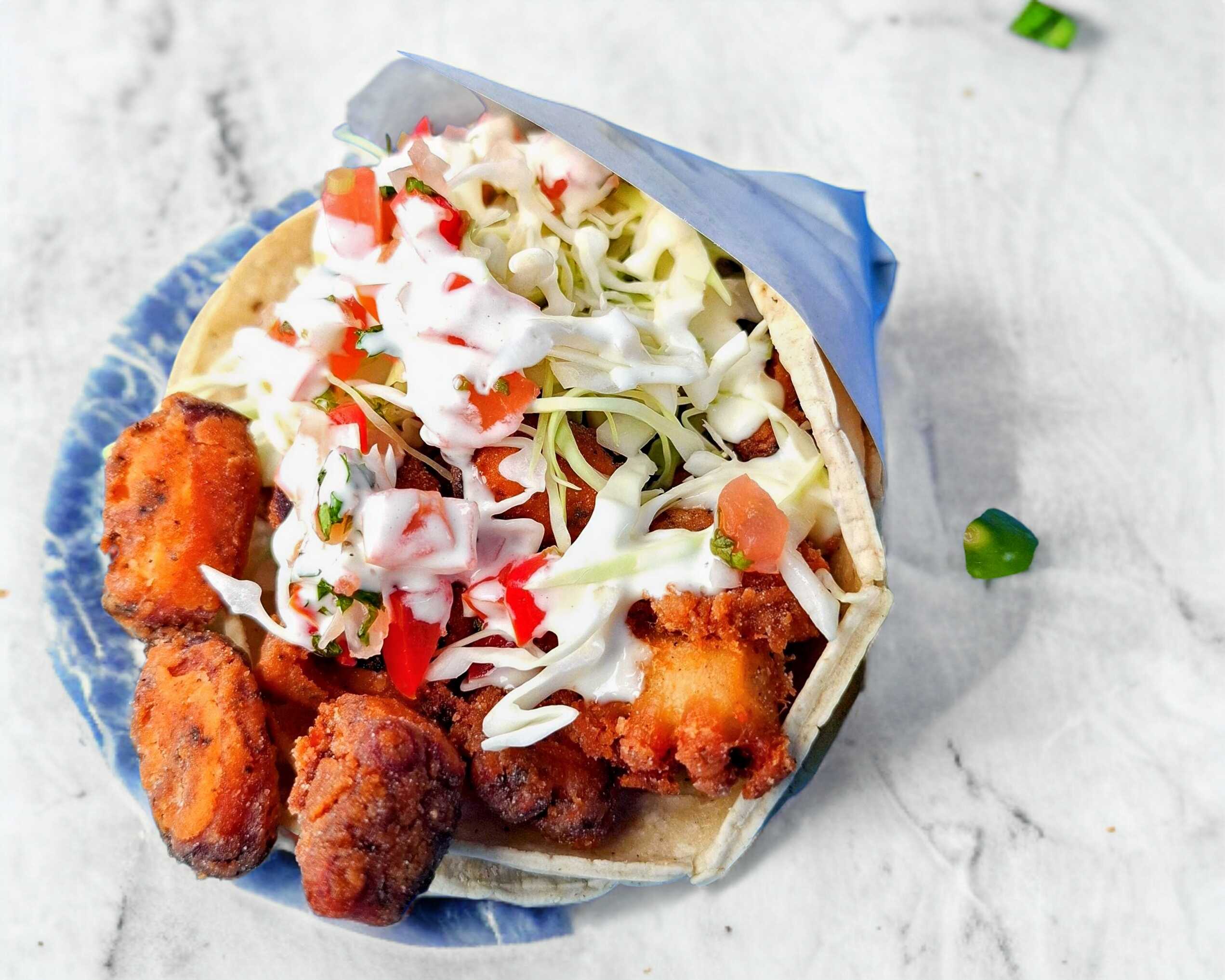 Taco de camarón capeado en tortilla de harina.