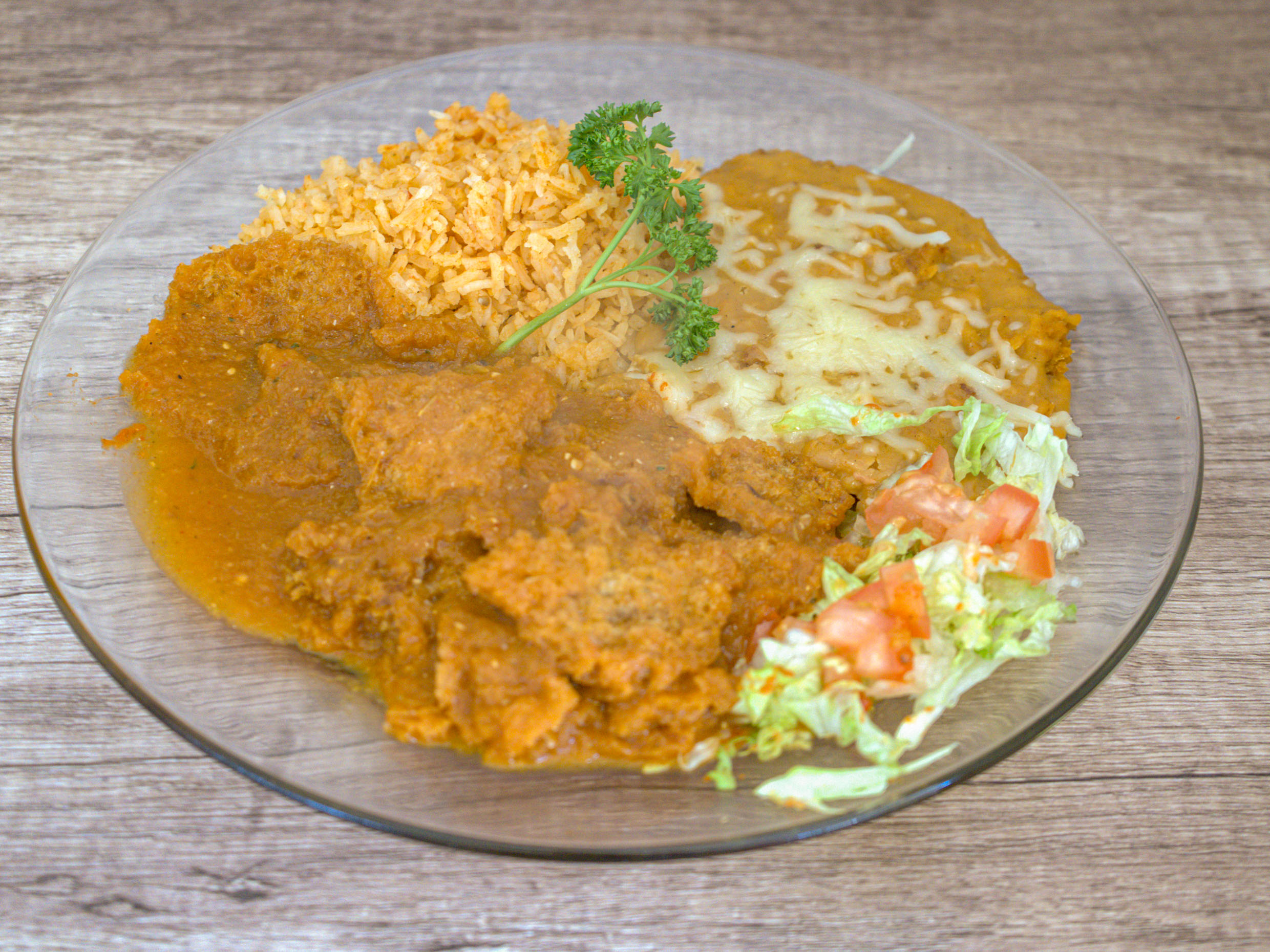 Milanesa Acompañada de Arroz, Papas y Frijoles