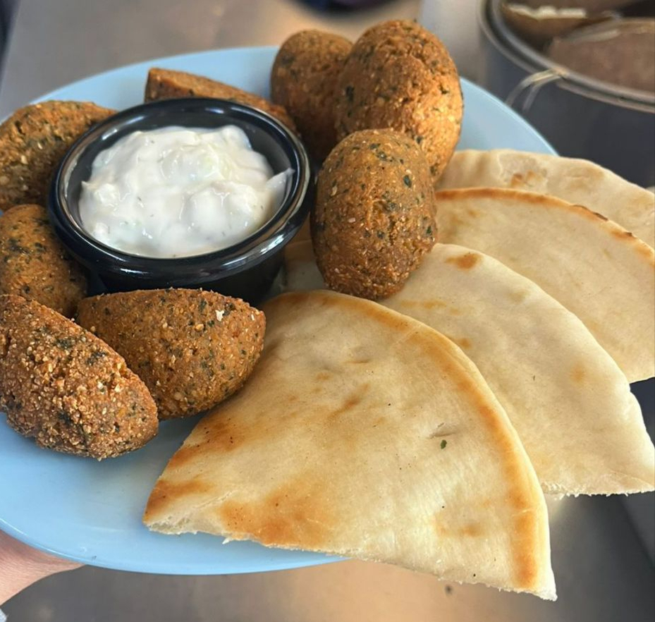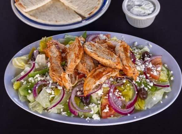 Lechuga, tomate, cebolla, morrón, pepperoncini, queso feta y aceituna kalamata, 1 pan pita, tzatziki, aderezo griego, incluye salsa roja. Contiene pescado.