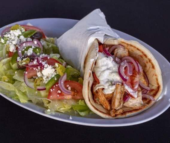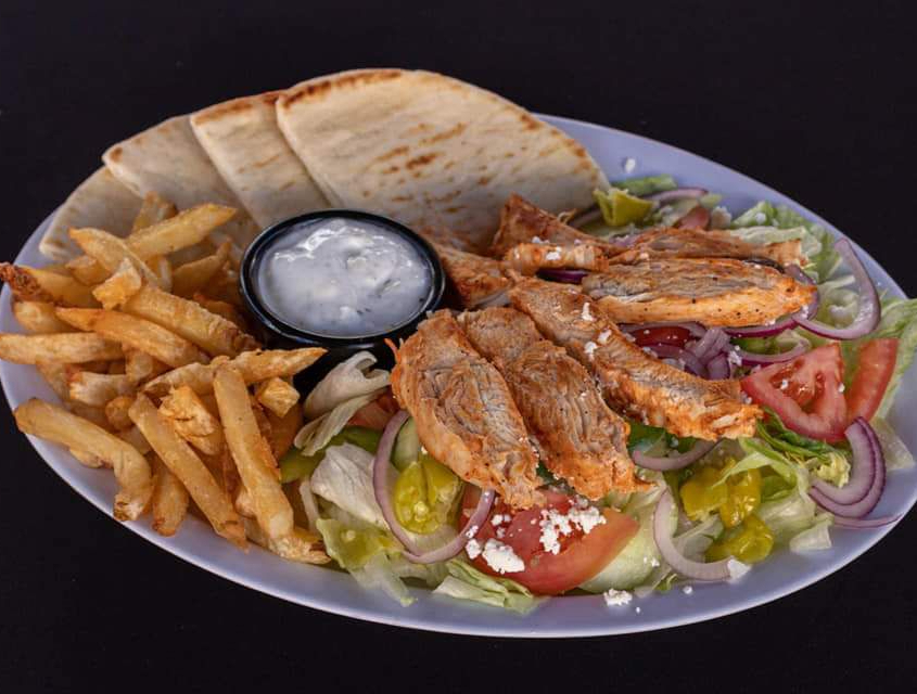 Pechuga de pollo a la plancha marinada, tomate, cebolla, tzatziki, papas a la francesa e incluyen salsa roja.
