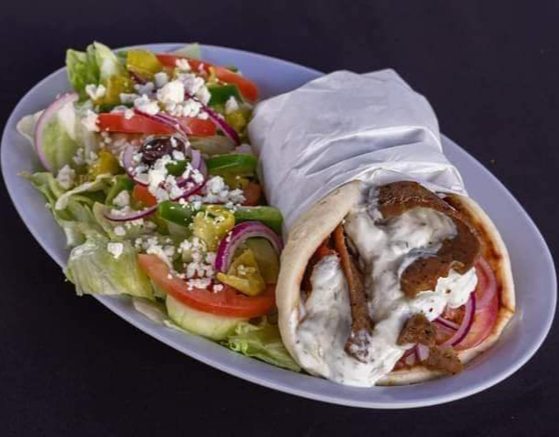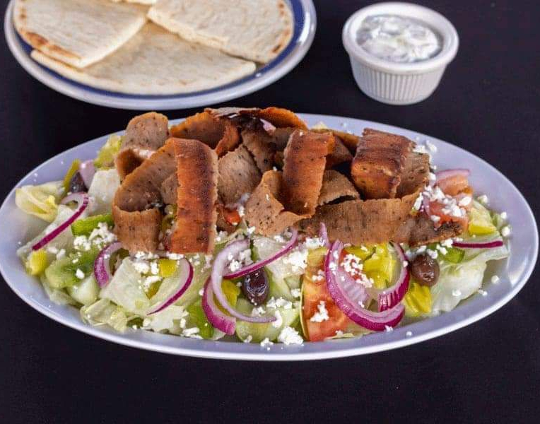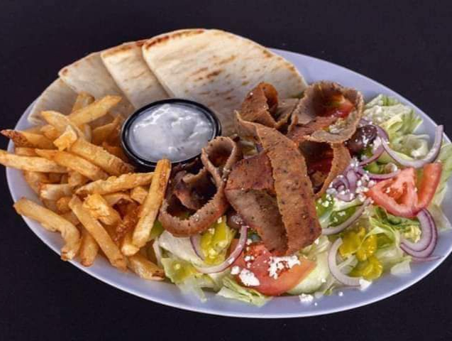 Base de ensalada griega. Carne gyro, pan de pita, aderezo de la casa, papas a la francesa tzatziki y salsa roja.