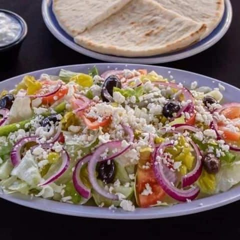 Base de ensalada griega, incluye tzatziki, pan de pita, aderezo de la casa y salsa roja.
