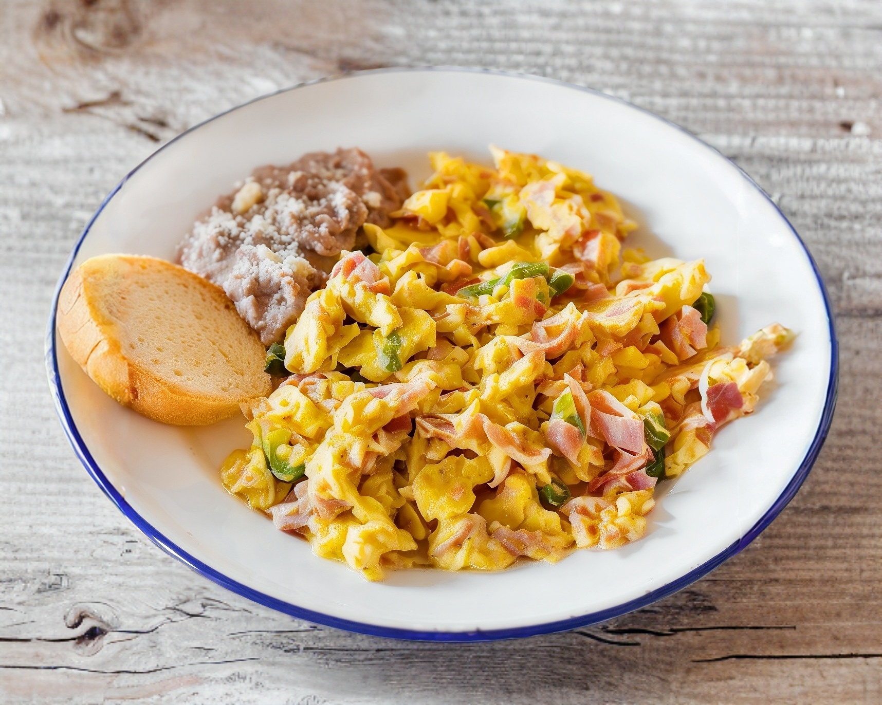 Huevo revuelto con jamon acompañados de frijoles y papa leonesa