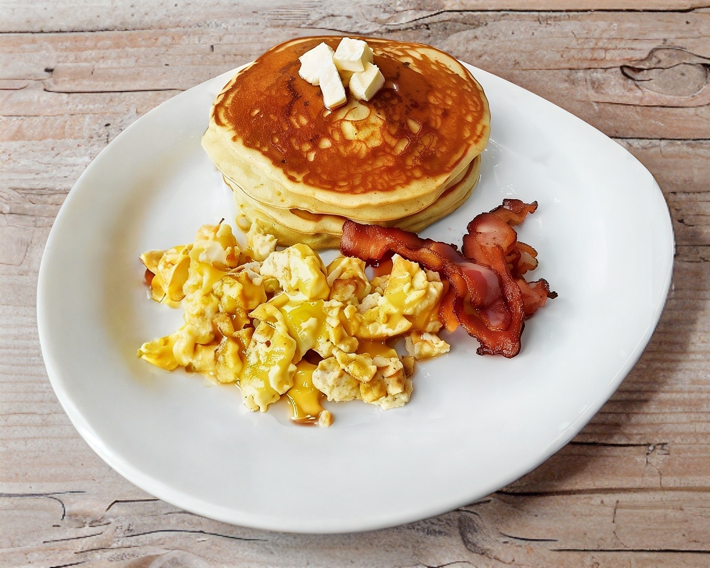 huevo revuelto con tocino, acompañado con tortillas, frijoles y papa leonesa