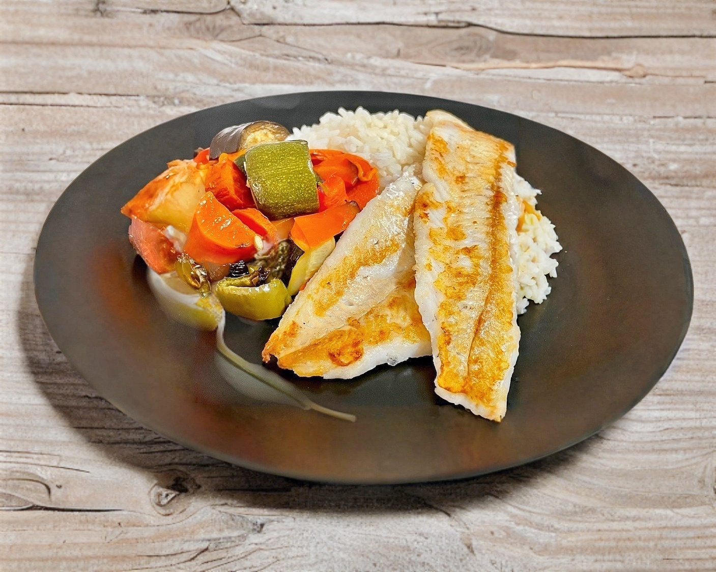 Filete de pescado ala plancha acompañado de guarniciones
