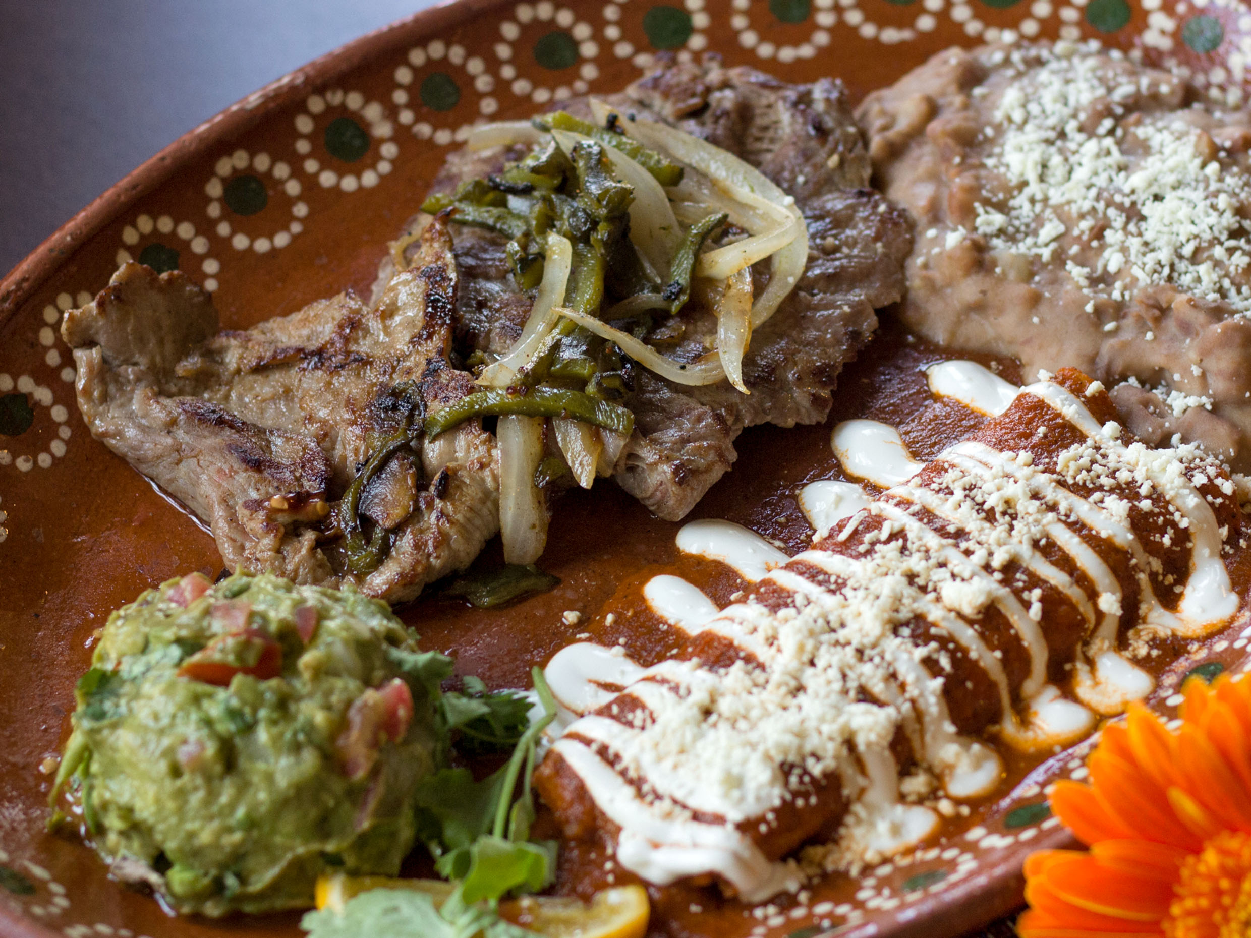 Carne arrachera con cebolla y rajas de chile poblano asadas, 1 enchilada roja de queso Monterrey, acompañado de frijol y guacamole