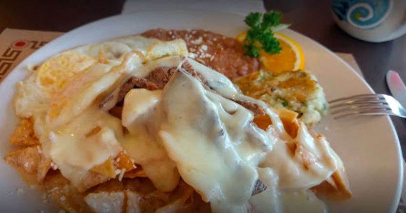 Queso Monterrey, espinaca, champiñón, bañado en crema chipotle, acompañado de frijol y chilaquiles