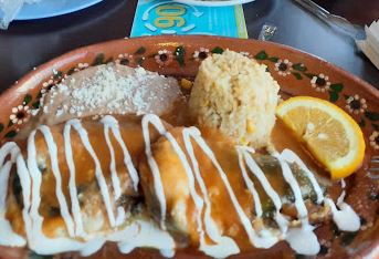 3 enchiladas de pollo, bañadas en crema suiza (de tomatillo) gratinadas, acompañadas de frijol y arroz