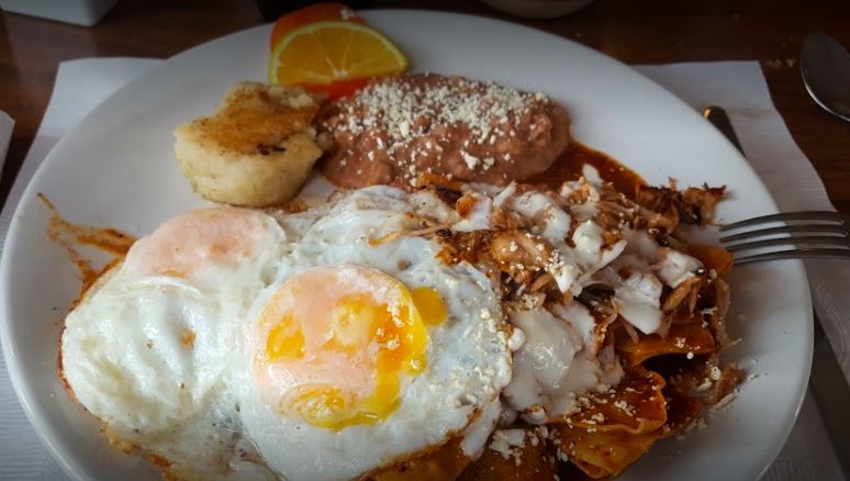 Trozo de arrachera, 2 piezas de huevo (estrellados o revueltos) acompañado de frijol y chilaquiles