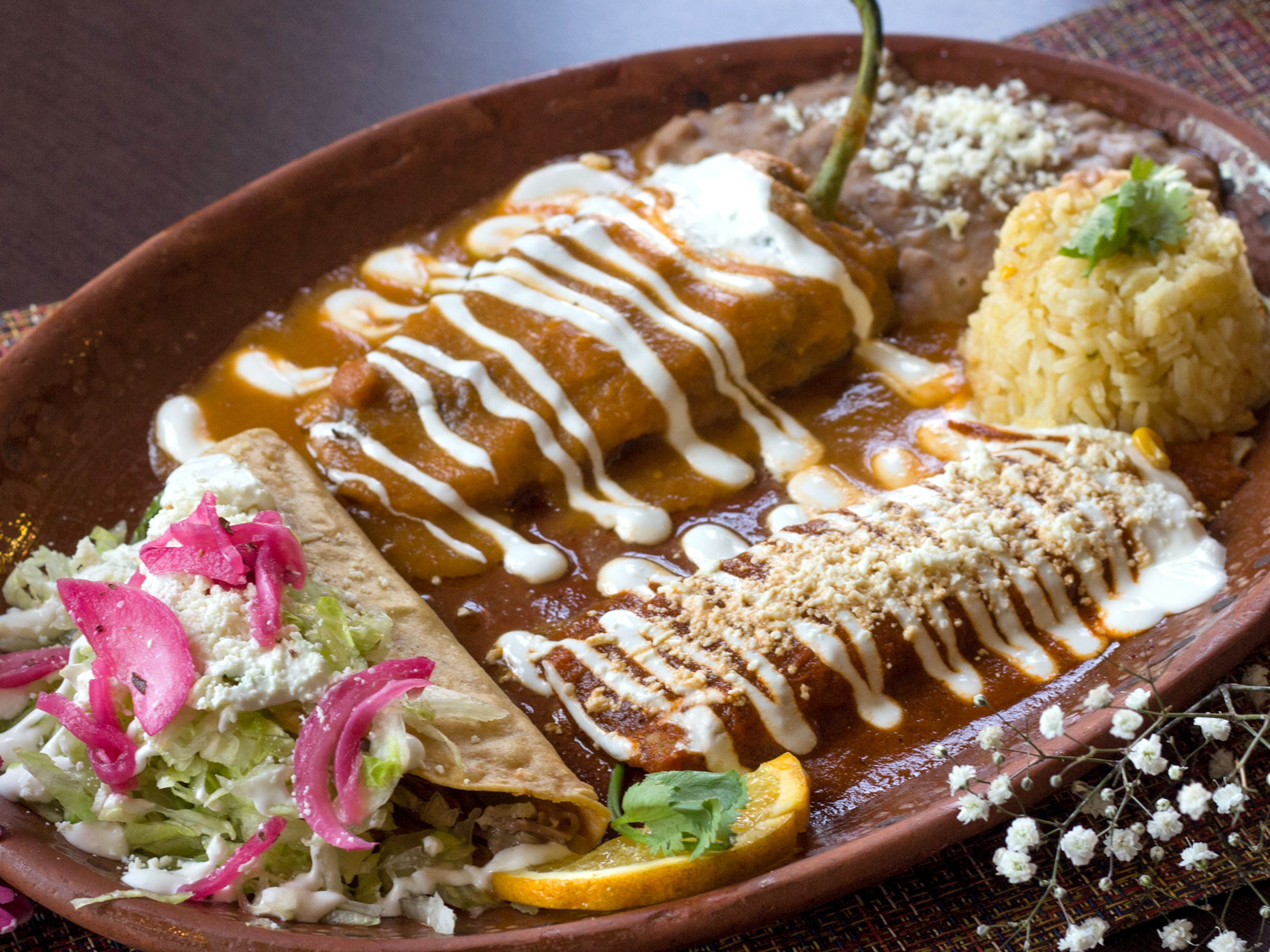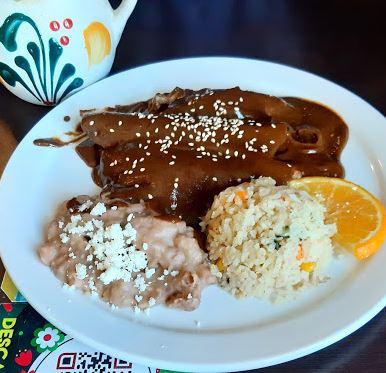 2 enchiladas de pollo bañadas con mole, 2 piezas de huevo (estrellados o revueltos) acompañado de arroz y frijol