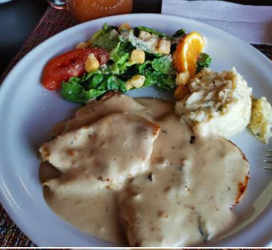Pechuga a la plancha bañada con la salsa especial de la casa, acompañada de arroz y ensalada
