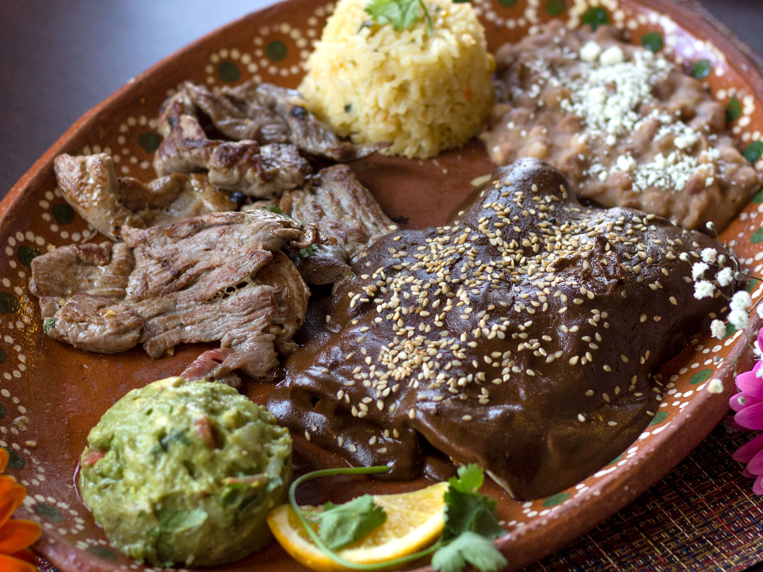 Arrachera, 2 enmoladas de pollo, acompañado de arroz, frijol y guacamole