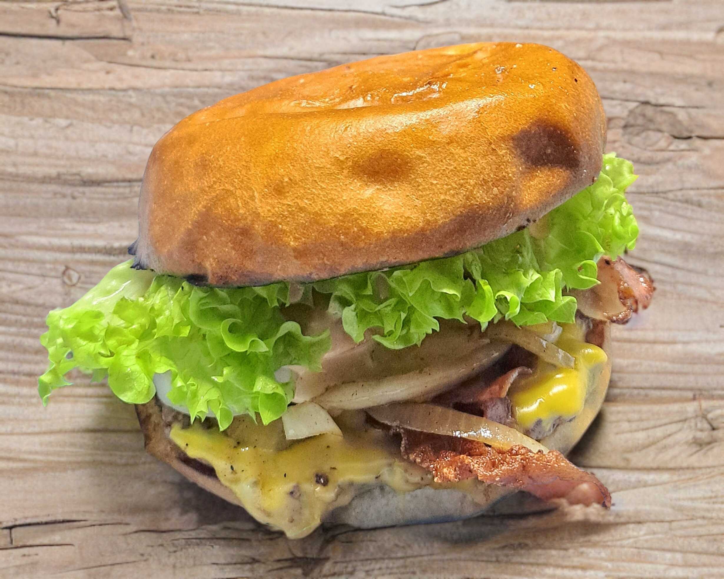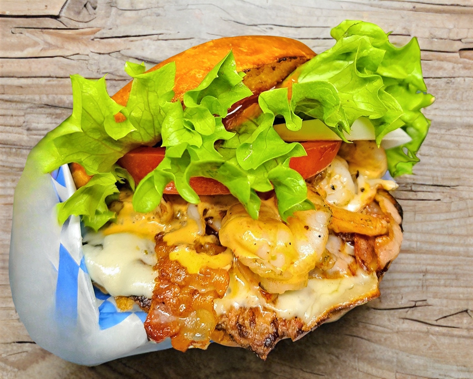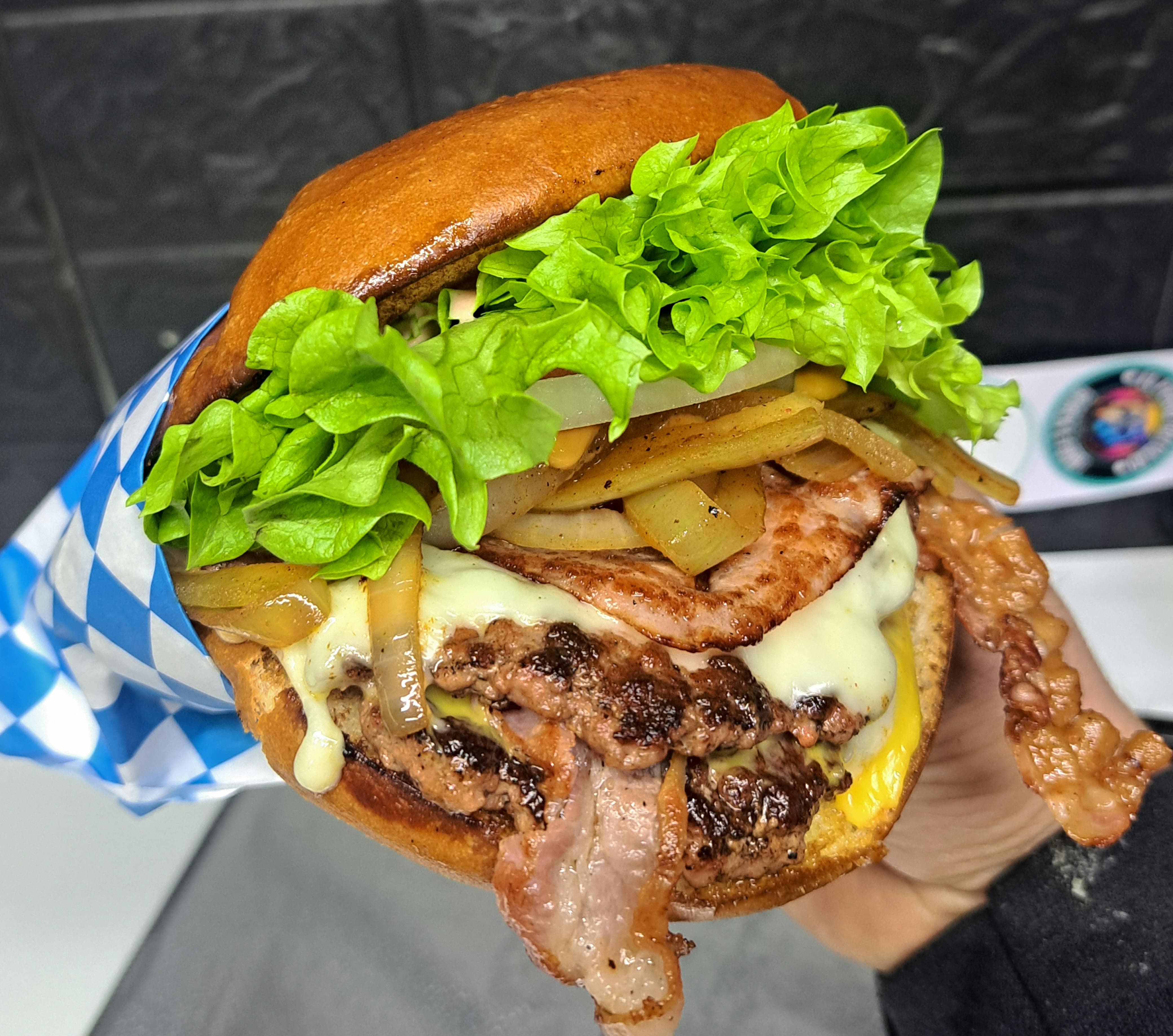 Doble carne de res, 3 quesos, tocino, jamón, cebolla asada y cruda, camarón, tomate, lechuga, chipotle, aderezo de la casa y cátsup., esta ENORME