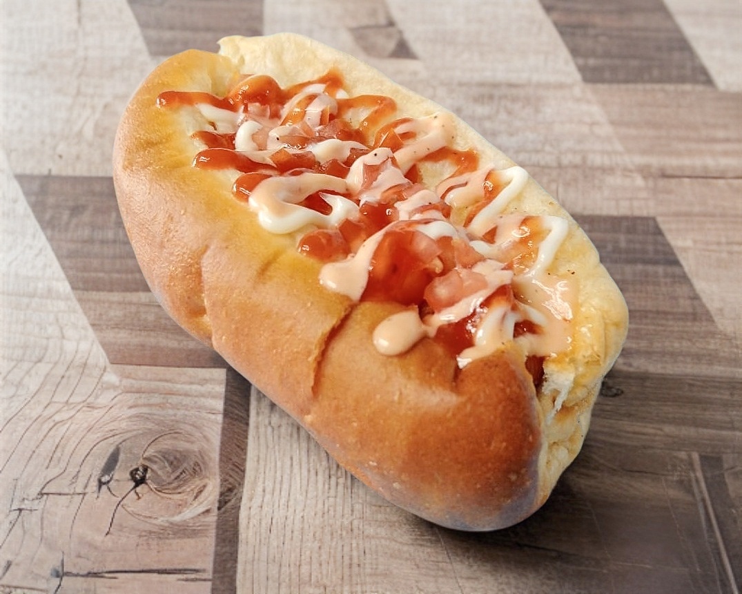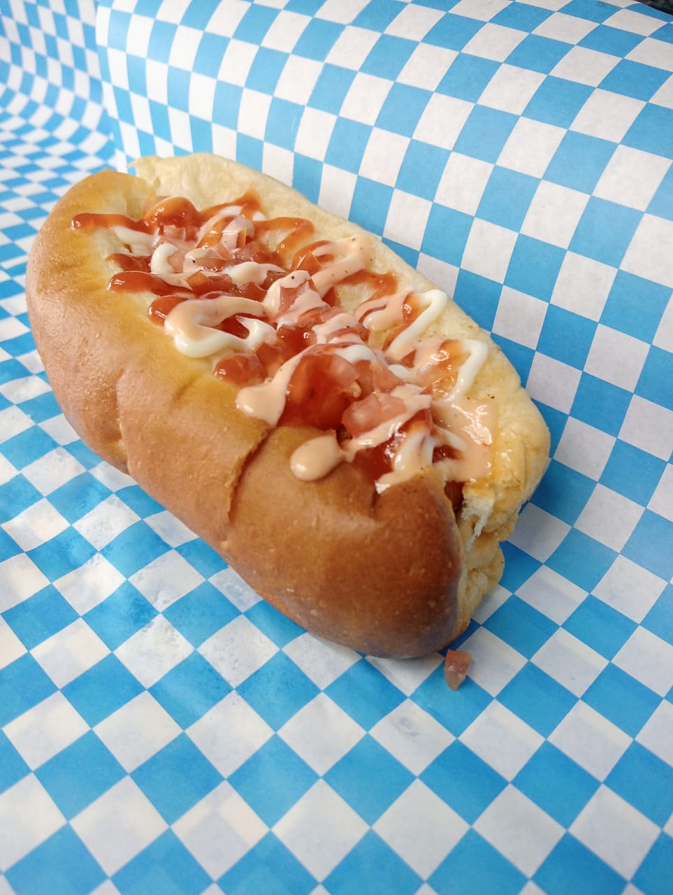 Salchicha de pavo envuelta en tocino, tomate, cebolla cruda y asada, mayonesa y cátsup.