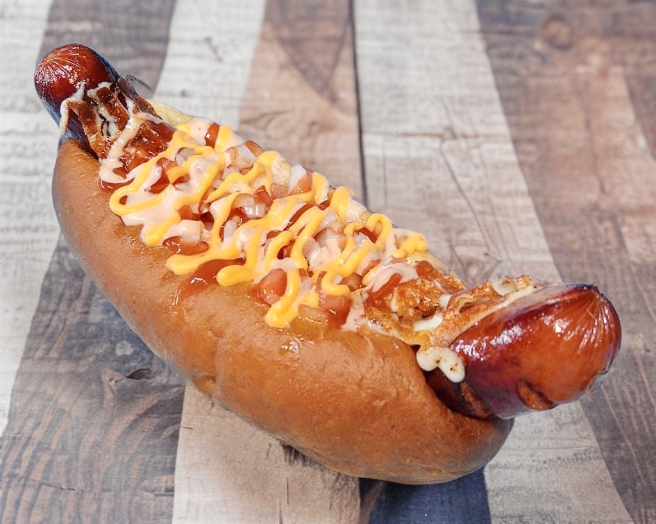 Salchicha de res ahumada tipo costco, queso mozzarella, cebolla cruda y asada, tomate, aderezo de la casa, mayonesa y cátsup.