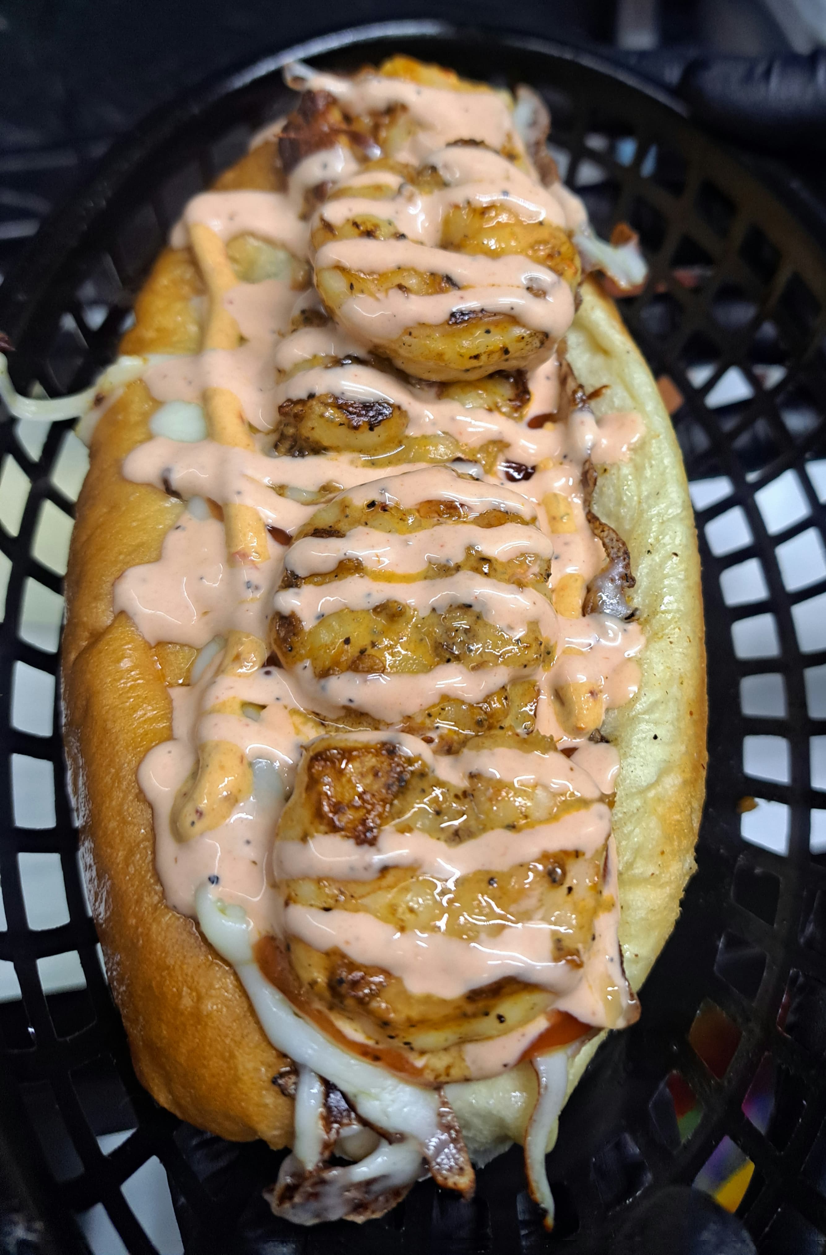 Salchicha de pavo envuelta en tocino, queso mozzarella, camarones, cebolla cruda y asada, tomate, aderezo de la casa, mayonesa y cátsup.