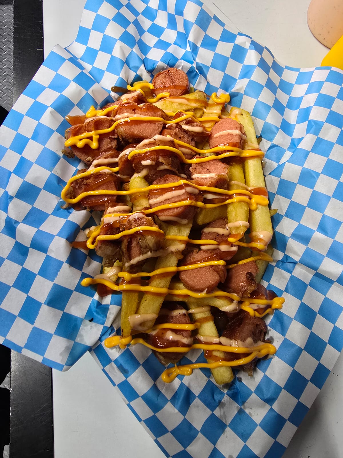 Salchichas de pavo envueltas en tocino, aderezo de la casa, queso amarillo de nachos y cátsup.